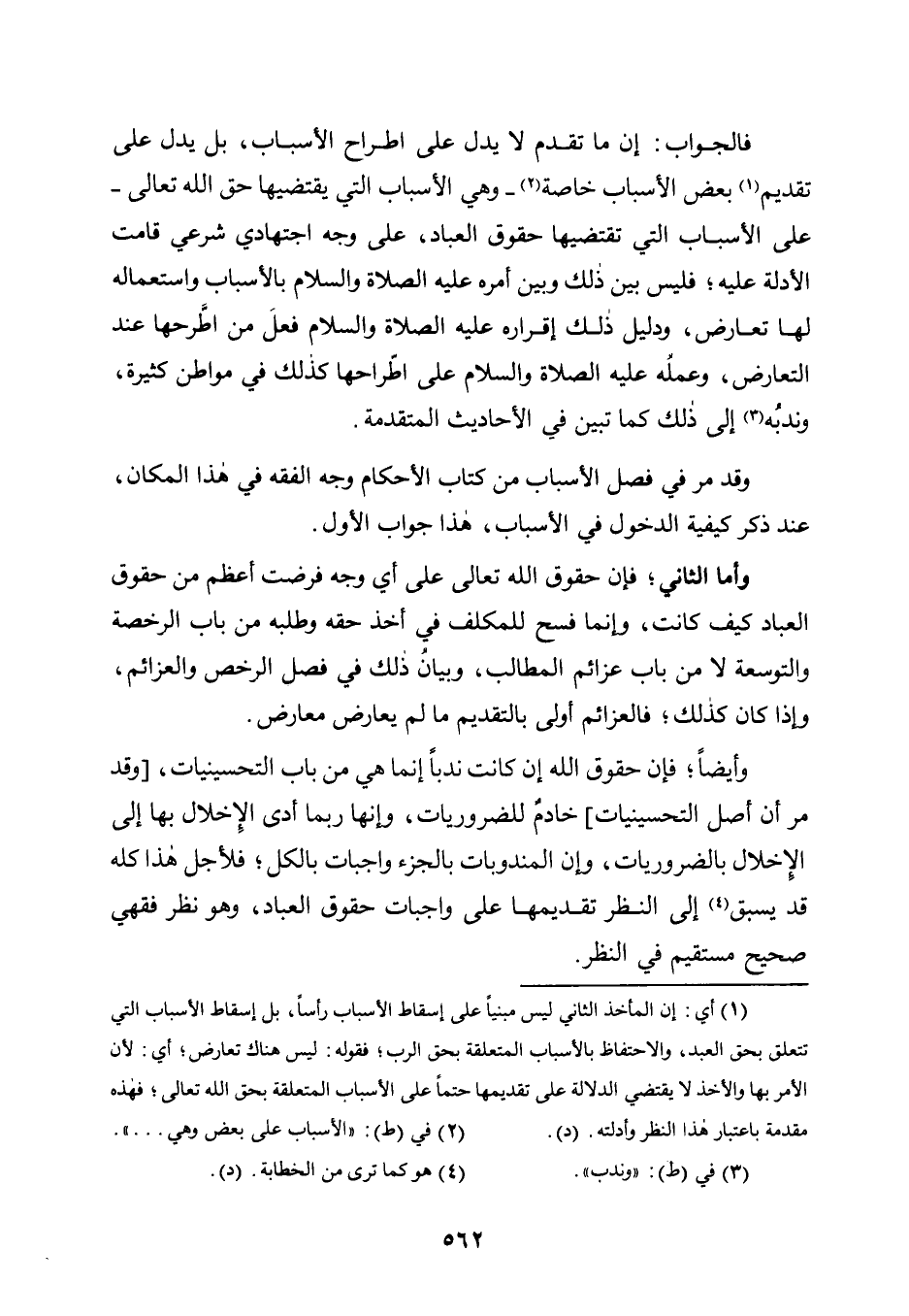 1 أي: أن المأخذ الثاني ليس مبينا على إسقاط الأسباب رأسا، بل إسقاط الأسباب التي تتعلق بحق العبد، والاحتفاظ بالأسباب المتعلقة بحق الرب؛ فقوله: ليس هناك تعارض؛ أي: لأن الأمر بها والأخذ لا يقتضي الدلالة على تقديمها حتما على الأسباب المتعلقة بحق الله تعالى؛ فهذه مقدمة باعتبار هذا النظر وأدلته. "د".