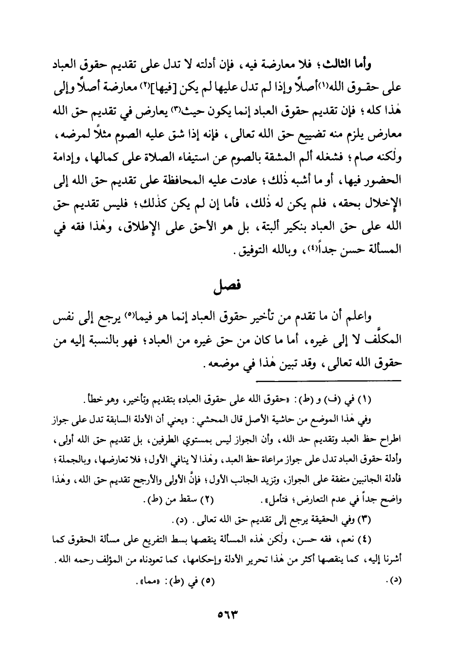وفي هذا الموضع من حاشية الأصل قال المحشي: "يعني أن الأدلة السابقة تدل على جواز اطراح حظ العبد وتقديم حد الله، وأن الجواز ليس بمستوي الطرفين، بل تقديم حق الله أولى، وأدلة حقوق العباد تدل على جواز مراعاة حظ العبد، وهذا لا ينافي الأول؛ فلا تعارضها، وبالجملة؛ فأدلة الجانبين متفقة على الجواز، وتزيد الجانب الأول؛ فإن الأولى والأرجح تقديم حق الله، وهذا واضح جدًّا في عدم التعارض؛ فتأمل".