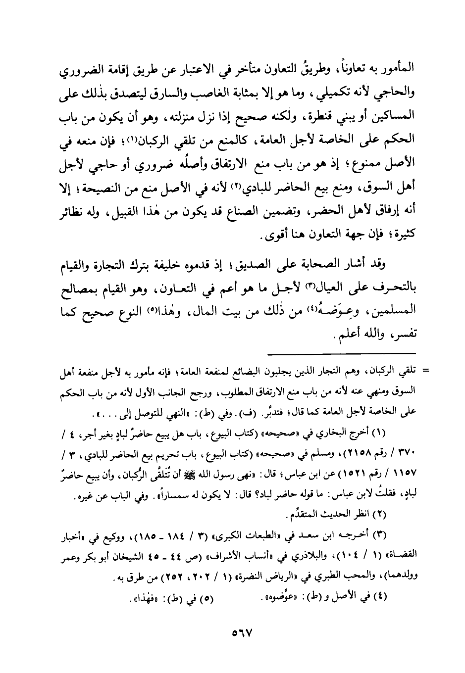 الْمَأْمُورِ بِهِ تَعَاوُنًا، وَطَرِيقُ التَّعَاوُنِ مُتَأَخِّرٌ فِي الِاعْتِبَارِ عَنْ طَرِيقِ إِقَامَةِ الضَّرُورِيِّ وَالْحَاجِيِّ لِأَنَّهُ تَكْمِيلِيٌّ، وَمَا هُوَ إِلَّا بِمَثَابَةِ الْغَاصِبِ وَالسَّارِقِ لِيَتَصَدَّقَ بِذَلِكَ عَلَى الْمَسَاكِينِ أَوْ يَبْنِيَ قَنْطَرَةً، وَلَكِنَّهُ صَحِيحٌ إِذَا نَزَلَ مَنْزِلَتَهُ، وَهُوَ أَنْ يَكُونَ مِنْ بَابِ الْحُكْمِ عَلَى الْخَاصَّةِ لِأَجْلِ الْعَامَّةِ، كَالْمَنْعِ مِنْ تَلَقِّي الرُّكْبَانِ1؛ فَإِنَّ مَنْعَهُ فِي الْأَصْلِ مَمْنُوعٌ؛ إِذْ هُوَ مِنْ بَابِ مَنْعِ الِارْتِفَاقِ وَأَصْلُهُ ضَرُورِيٌّ أَوْ حَاجِيٌّ لِأَجْلِ أَهْلِ السُّوقِ، وَمَنْعِ بَيْعِ الْحَاضِرِ لِلْبَادِي2 لِأَنَّهُ فِي الْأَصْلِ مَنْعٌ مِنَ النَّصِيحَةِ؛ إِلَّا أَنَّهُ إِرْفَاقٌ لِأَهْلِ الْحَضَرِ، وَتَضْمِينُ الصُّنَّاعِ قَدْ يَكُونُ مِنْ هَذَا الْقَبِيلِ، وَلَهُ نَظَائِرُ كَثِيرَةٌ؛ فَإِنَّ جِهَةَ التَّعَاوُنِ هُنَا أَقْوَى.