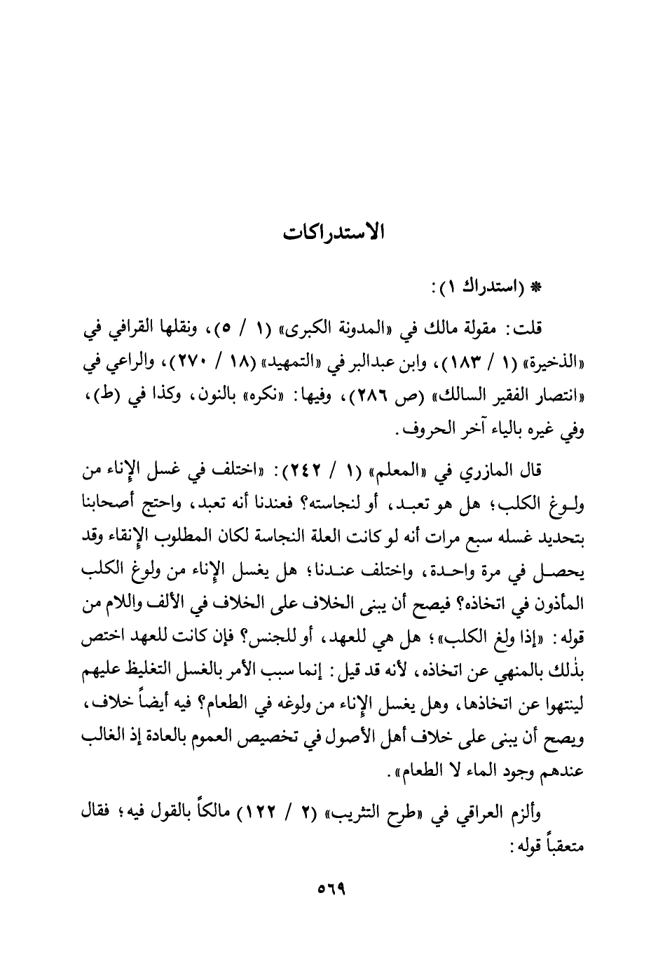 قلت: مقوله مالك في "المدونة الكبرى" "1/ 5"، ونقلها القرافي في "الذخيرة" "1/ 183"، وابن عبد البر في "التمهيد" "18/ 270"، والراعي في "انتصار الفقير السالك" "ص286"، وفيها: "نكره" بالنون، وكذا في "ط"، وفي غيره بالياء آخر الحروف.