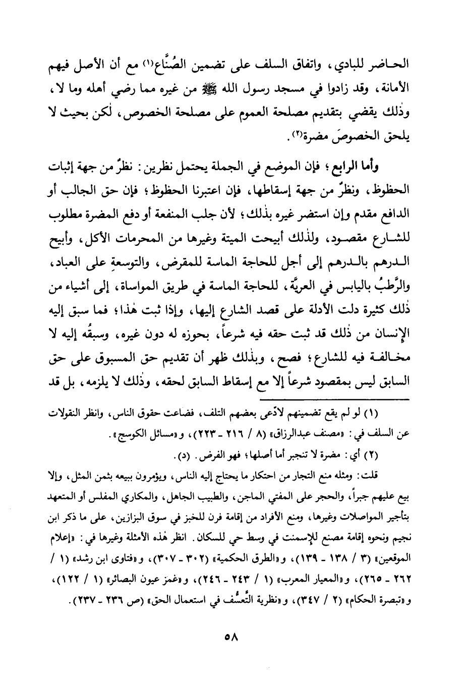 الْحَاضِرِ لِلْبَادِي، وَاتِّفَاقِ السَّلَفِ عَلَى تَضْمِينِ الصُّنَّاعِ1 مَعَ أَنَّ الْأَصْلَ فِيهِمُ الْأَمَانَةُ، وَقَدْ زَادُوا فِي مَسْجِدِ رَسُولِ اللَّهِ صَلَّى اللَّهُ عَلَيْهِ وَسَلَّمَ مِنْ غَيْرِهِ مِمَّا رَضِيَ أَهْلُهُ وَمَا لَا، وَذَلِكَ يَقْضِي بِتَقْدِيمِ مَصْلَحَةِ الْعُمُومِ عَلَى مَصْلَحَةِ الْخُصُوصِ، لَكِنْ بِحَيْثُ لَا يَلْحَقُ الْخُصُوصَ مَضَرَّةٌ2.