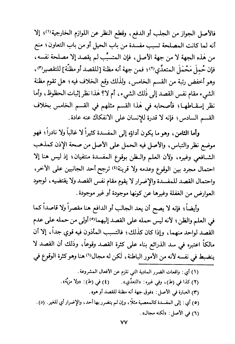 وَأَيْضًا؛ فَإِنَّهُ لَا يَصِحُّ أَنْ يُعَدَّ الْجَالِبُ أَوِ الدَّافِعُ هُنَا مُقَصِّرًا وَلَا قَاصِدًا كَمَا فِي الْعِلْمِ وَالظَّنِّ؛ لِأَنَّهُ لَيْسَ حَمْلُهُ عَلَى الْقَصْدِ إِلَيْهِمَا5 أَوْلَى مِنْ حَمْلِهِ عَلَى عَدَمِ الْقَصْدِ لِوَاحِدٍ مِنْهُمَا، وَإِذَا كَانَ كَذَلِكَ؛ فَالتَّسَبُّبُ الْمَأْذُونُ فِيهِ قَوِيٌّ جِدًّا، إِلَّا أَنَّ مَالِكًا اعْتَبَرَهُ فِي سَدِّ الذَّرَائِعِ بِنَاءً عَلَى كَثْرَةِ الْقَصْدِ وُقُوعًا، وَذَلِكَ أَنَّ الْقَصْدَ لَا يَنْضَبِطُ فِي نَفْسِهِ لِأَنَّهُ مِنَ الْأُمُورِ الْبَاطِنَةِ، لَكِنْ لَهُ مَجَالٌ6 هُنَا وَهُوَ كَثْرَةُ الوقوع في