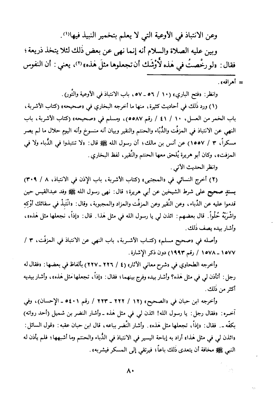 2 أخرج النسائي في "المجتبى" "كتاب الأشربة، باب الإذن في الانتباذ، 8/ 309" بسند صحيح على شرط الشيخين عن أبي هريرة؛ قال: نهى رسول الله صلى الله عليه وسلم وفد عبد القيس حين قدموا عليه عن الدباء، وعن النقير وعن المزفت والمزاد والمجبوبة، وقال: "انتبذ في سقائك أوكه واشربه حلوا. قال بعضهم: ائذن لي يا رسول الله في مثل هذا. قال: "إذًا، نجعلها مثل هذه"، وأشار بيده يصف ذلك.