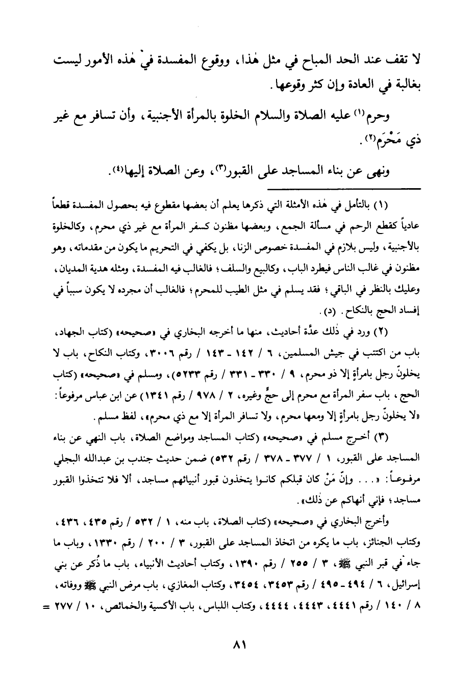 وَحَرَّمَ1 عَلَيْهِ الصَّلَاةُ وَالسَّلَامُ الْخَلْوَةَ بِالْمَرْأَةِ الْأَجْنَبِيَّةِ، وَأَنْ تُسَافِرَ مَعَ غَيْرِ ذِي مَحْرَمٍ2.
