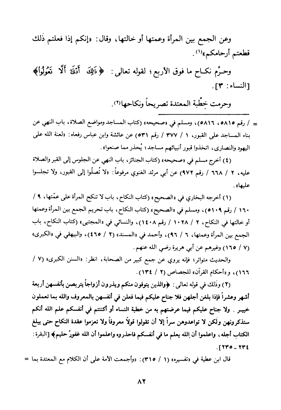 وَعَنِ الْجَمْعِ بَيْنَ الْمَرْأَةِ وَعَمَّتِهَا أَوْ خَالَتِهَا، وقال: "إنكم إذا فعلتهم ذَلِكَ قَطَّعْتُمْ أَرْحَامَكُمْ" 1.