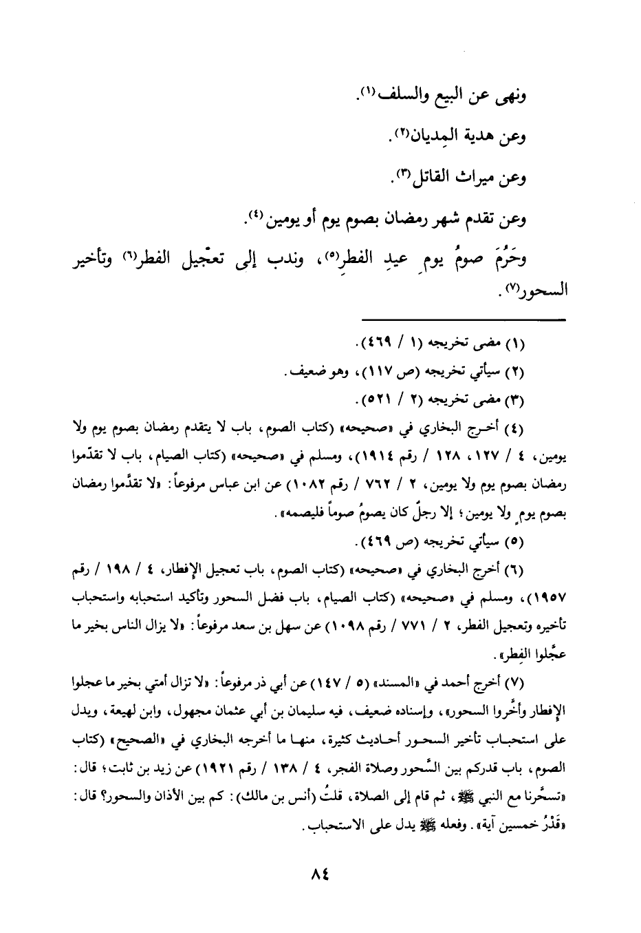 وَحَرَّمَ صَوْمَ يَوْمِ عِيدِ الْفِطْرِ5، وَنَدَبَ إِلَى تَعْجِيلِ الْفِطْرِ6 وَتَأْخِيرِ السحور7.