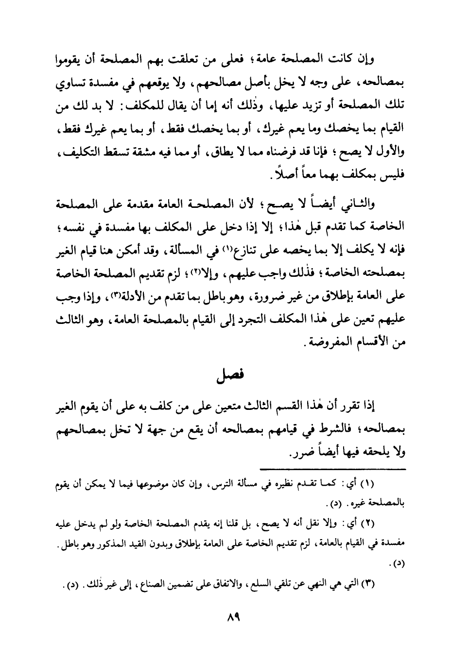وَإِنْ كَانَتِ الْمَصْلَحَةُ عَامَّةً؛ فَعَلَى مَنْ تَعَلَّقَتْ بِهِمُ الْمَصْلَحَةُ أَنْ يَقُومُوا بِمَصَالِحِهِ، عَلَى وَجْهٍ لَا يَخِلُّ بِأَصْلِ مَصَالِحِهِمْ، وَلَا يُوقِعْهُمْ فِي مَفْسَدَةٍ تُسَاوِي تِلْكَ الْمَصْلَحَةَ أَوْ تَزِيدُ عَلَيْهَا، وَذَلِكَ أَنَّهُ إِمَّا أَنْ يُقَالَ لِلْمُكَلَّفِ: لَا بُدَّ لَكَ مِنَ الْقِيَامِ بِمَا يَخُصُّكَ وَمَا يَعُمُّ غَيْرَكَ، أَوْ بِمَا يَخُصُّكَ فَقَطْ، أَوْ بم يَعُمُّ غَيْرَكَ فَقَطْ، وَالْأَوَّلُ لَا يَصْحُّ؛ فَإِنَّا قَدْ فَرَضْنَاهُ مِمَّا لَا يُطَاقُ، أَوْ مِمَّا فِيهِ مَشَقَّةٌ تُسْقِطُ التَّكْلِيفَ، فَلَيْسَ بِمُكَلَّفٍ بِهِمَا مَعًا أَصْلًا.