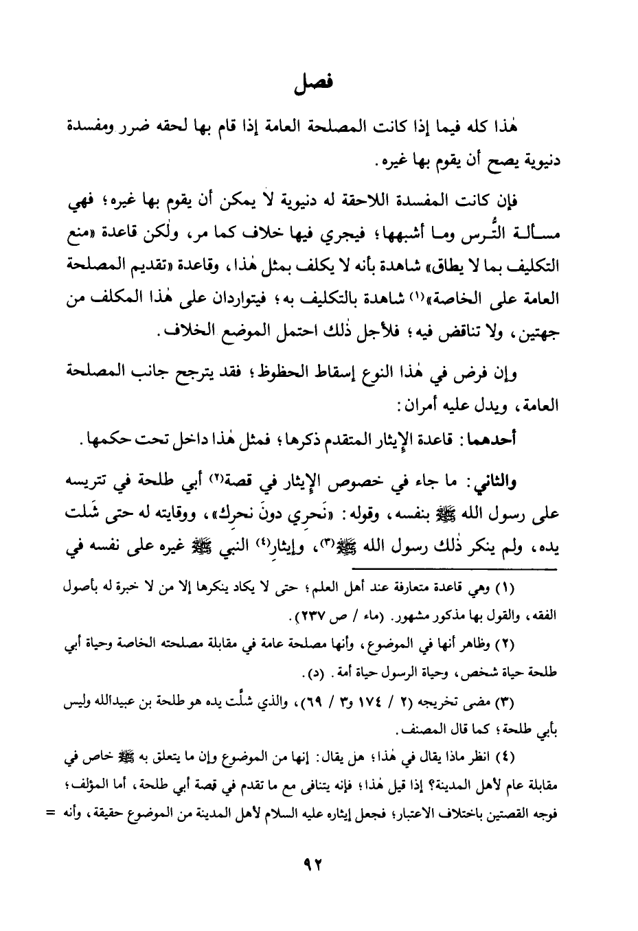 4 انظر ماذا يقال في هذا؛ هل يقال: إنها من الموضوع وإن ما يتعلق به صلى الله عليه وسلم خاص في مقابلة عام لأهل المدينة؟ إذا قيل هذا؛ فإنه يتنافى مع ما تقدم في قصة أبي طلحة، أما المؤلف؛ فوجه القصتين باختلاف الاعتبار؛ فجعل إيثاره عليه السلام لأهل المدينة من الموضوع حقيقة، وأنه خاص في مقابلة عام، وجعل إيثار أبي طلحة خاصًا لعام باعتبار أن حياة الرسول مصلحة للدين وأهله؛ فعليك بالنظر في الجميع. "د".
