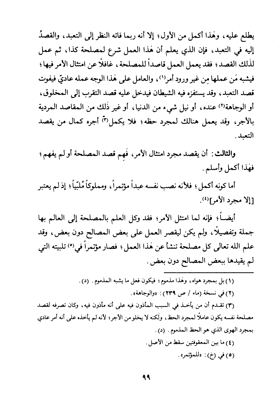 3 تقدم أن من يأخذ في السبب المأذون فيه على أنه مأذون فيه، وكان تصرفه لقصد مصلحة نفسه يكون عاملا لمجرد الحظ، ولكنه لا يخلو من الأجر؛ لأنه لم يأخذه على أنه أمر عادي بمجرد الهوى الذي هو الحظ المذموم. "د".