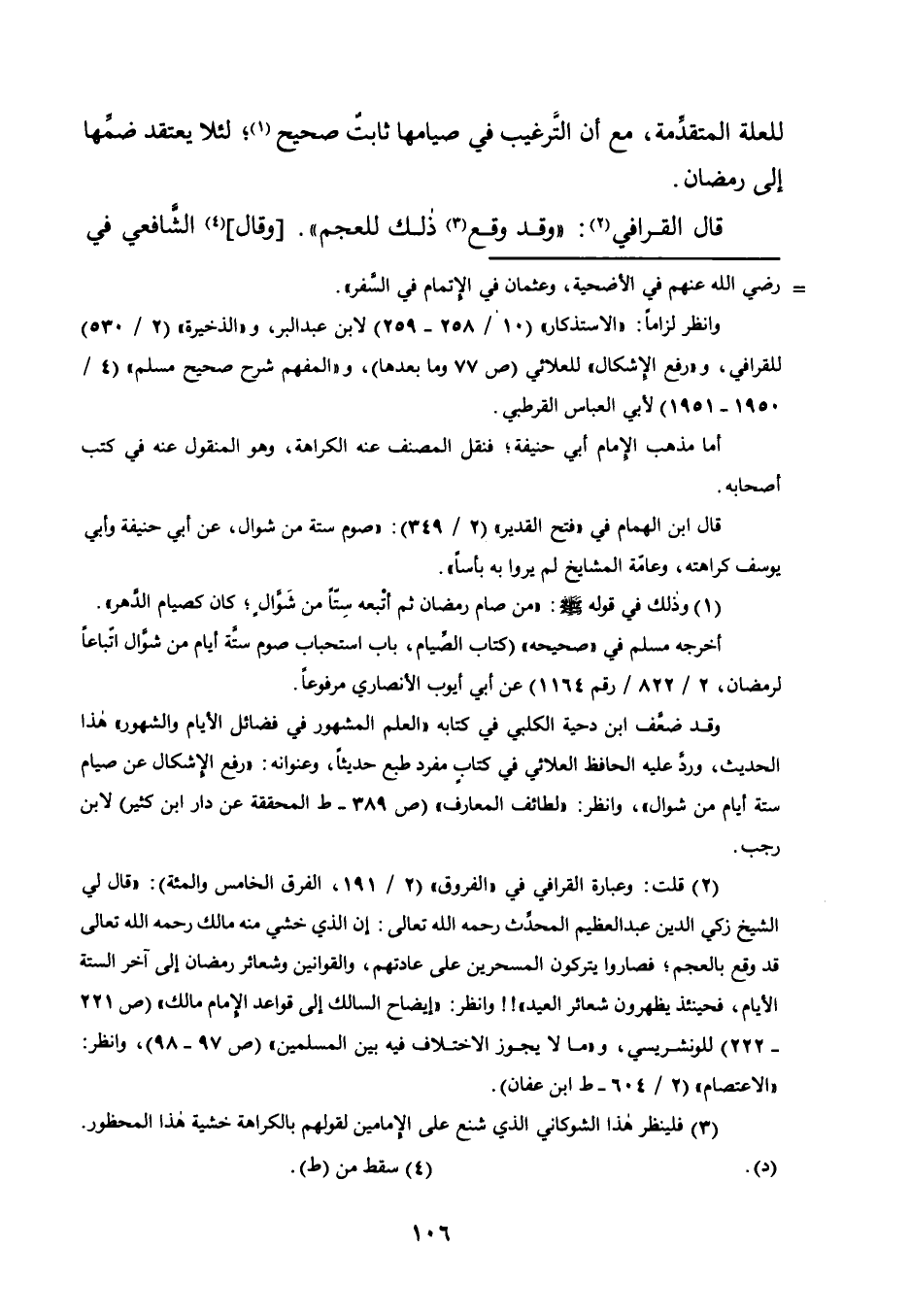 2 قلت: وعبارة القرافي في "الفروق" "2/ 191، الفرق الخامس والمائة": "قال لي الشيخ زكي الدين عبد العظيم المحدث, رحمه الله تعالى: إن الذي خشي منه مالك -رحمه الله تعالى- قد وقع بالعجم؛ فصاروا يتركون المسحرين على عادتهم، والقوانين وشعائر رمضان إلى آخر الستة الأيام، فحينئذ يظهرون شعائر العيد"!! وانظر: "إيضاح السالك إلى قواعد الإمام مالك" "ص221-222" للونشريسي، و"ما لا يجوز الاختلاف فيه بين المسلمين" "ص97-98"، وانظر: "الاعتصام" "2/ 604, ط ابن عفان".