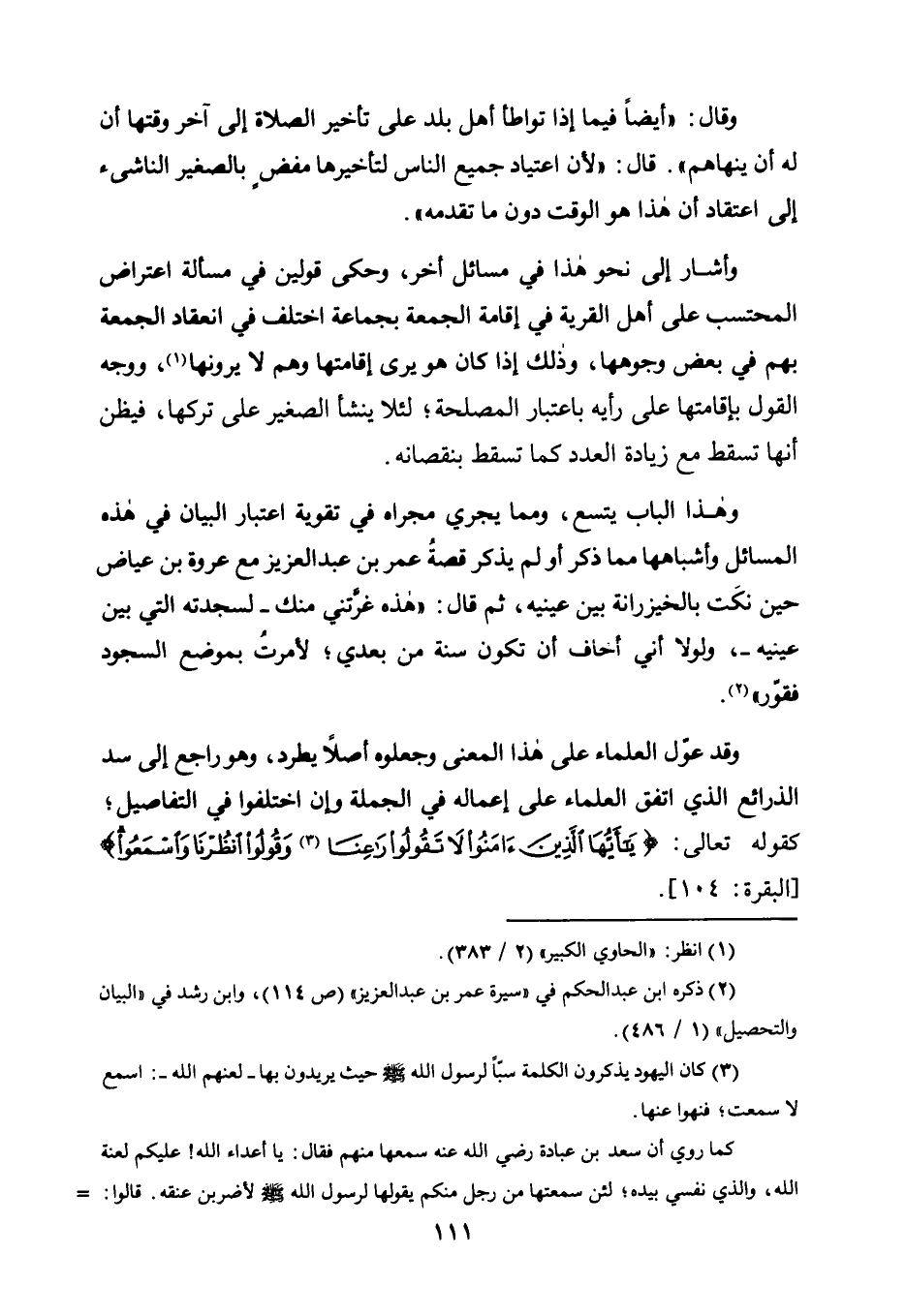 وَأَشَارَ إِلَى نَحْوِ هَذَا فِي مَسَائِلَ أُخَرَ، وَحَكَى قَوْلَيْنِ فِي مَسْأَلَةِ اعْتِرَاضِ الْمُحْتَسِبِ عَلَى أهل القرية في إقامة الجمعة بجماعة اختلفت فِي انْعِقَادِ الْجُمُعَةِ بِهِمْ فِي بَعْضِ وُجُوهِهَا، وَذَلِكَ إِذَا كَانَ هُوَ يَرَى إِقَامَتَهَا وَهُمْ لَا يَرَوْنَهَا1، وَوَجْهُ الْقَوْلِ بِإِقَامَتِهَا عَلَى رَأْيِهِ بِاعْتِبَارِ الْمَصْلَحَةِ؛ لِئَلَّا يَنْشَأَ الصَّغِيرُ عَلَى تَرْكِهَا، فَيَظُنُّ أَنَّهَا تَسْقُطُ مَعَ زِيَادَةِ الْعَدَدِ كَمَا تَسْقُطُ بِنُقْصَانِهِ.