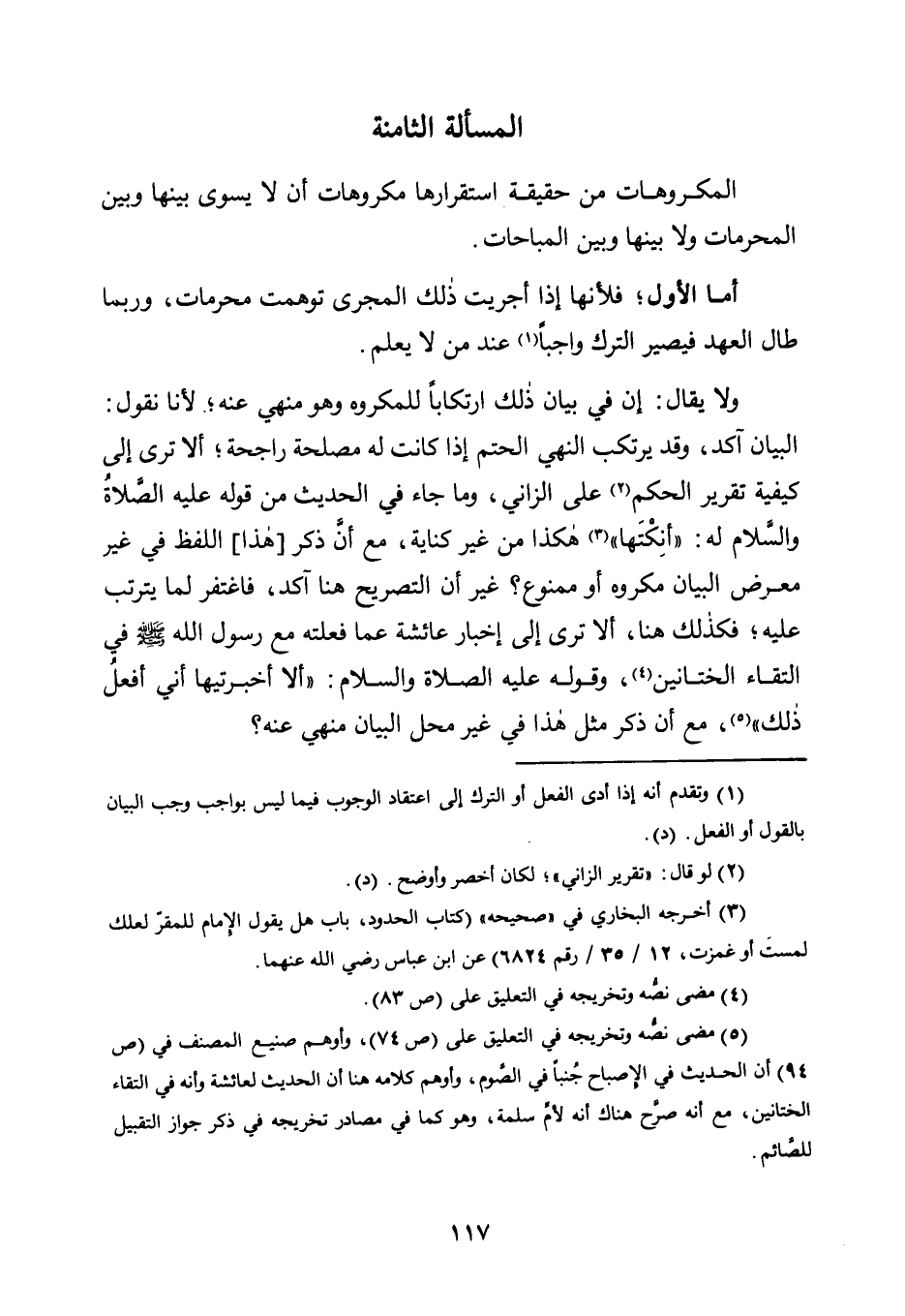 الْمَكْرُوهَاتُ مِنْ حَقِيقَةِ اسْتِقْرَارِهَا مَكْرُوهَاتٍ أَنْ لَا يُسَوَّى بَيْنَهَا وَبَيْنَ الْمُحَرَّمَاتِ وَلَا بَيْنَهَا وَبَيْنَ الْمُبَاحَاتِ.