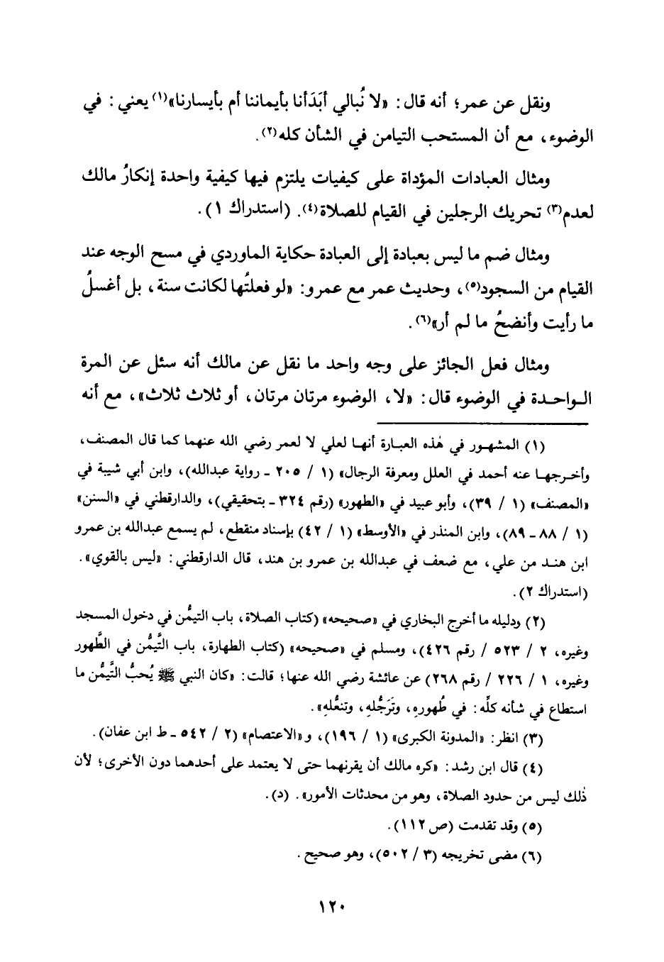 وَمِثَالُ الْعِبَادَاتِ الْمُؤَدَّاةِ عَلَى كَيْفِيَّاتٍ يُلْتَزَمُ فِيهَا كَيْفِيَّةٌ وَاحِدَةٌ إِنْكَارُ مَالِكٍ لِعَدَمِ3 تَحْرِيكِ الرِّجْلَيْنِ في القيام للصلاة4. "استدراك*".