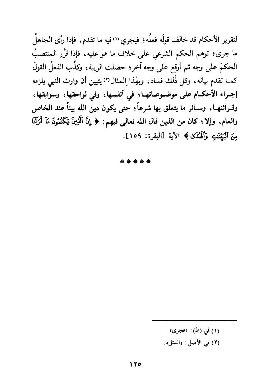 لِتَقْرِيرِ الْأَحْكَامِ قَدْ خَالَفَ قَوْلُهُ فِعْلَهُ؛ فَيَجْرِي1 فِيهِ مَا تَقَدَّمَ، فَإِذَا رَأَى الْجَاهِلُ مَا جَرَى؛ تَوَهَّمَ الْحُكْمَ الشَّرْعِيَّ عَلَى خِلَافِ مَا هُوَ عَلَيْهِ، فَإِذَا قَرَّرَ الْمُنْتَصِبُ الْحُكْمَ عَلَى وَجْهٍ ثُمَّ أَوْقَعَ عَلَى وَجْهٍ آخَرَ؛ حَصَلَتِ الرِّيبَةُ، وَكَذَّبَ الْفِعْلُ الْقَوْلَ كَمَا تَقَدَّمَ بَيَانُهُ، وَكُلُّ ذَلِكَ فَسَادٌ، وَبِهَذَا الْمِثَالِ2 يَتَبَيَّنُ أَنَّ وَارِثَ النَّبِيِّ يَلْزَمُهُ إِجْرَاءُ الْأَحْكَامِ عَلَى مَوْضُوعَاتِهَا؛ فِي أَنْفُسِهَا، وَفِي لَوَاحِقِهَا، وَسَوَابِقِهَا، وَقَرَائِنِهَا، وَسَائِرِ مَا يَتَعَلَّقُ بِهَا شَرْعًا؛ حَتَّى يَكُونَ دِينُ اللَّهِ بَيِّنًا عِنْدَ الْخَاصِّ وَالْعَامِّ، وَإِلَّا؛ كَانَ مِنَ الَّذِينَ قَالَ اللَّهُ تَعَالَى فِيهِمْ: {إِنَّ الَّذِينَ يَكْتُمُونَ مَا أَنْزَلْنَا مِنَ الْبَيِّنَاتِ وَالْهُدَى} الآية [البقرة: 159] .
