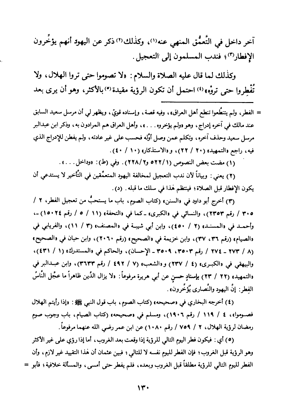 3 أخرج أبو داود في "السنن" "كتاب الصوم، باب ما يستحب من تعجيل الفطر، 2/ 305/ رقم 2353"، والنسائي في "الكبرى", كما في "التحفة" "11/ 5/ رقم 15024"، وأحمد في "المسند" "2/ 450"، وابن أبي شيبة في "المصنف" "3/ 11"، والفريابي في "الصيام" "رقم 36، 37"، وابن خزيمة في "الصحيح" "رقم 2060"، وابن حبان في "الصحيح" "8/ 273-274/ رقم 3503، 3509, الإحسان"، والحاكم في "المستدرك" "1/ 431"، والبيهقي في "الكبرى" "4/ 237" و"الشعب" "7/ 492/ رقم 3633"، وابن عبد البر في "التمهيد" "22/ 23" بإسناد حسن عن أبي هريرة مرفوعًا: "لا يزال الدين ظاهرًا ما عجل الناس الفطر, إن اليهود والنصارى يؤخرون".