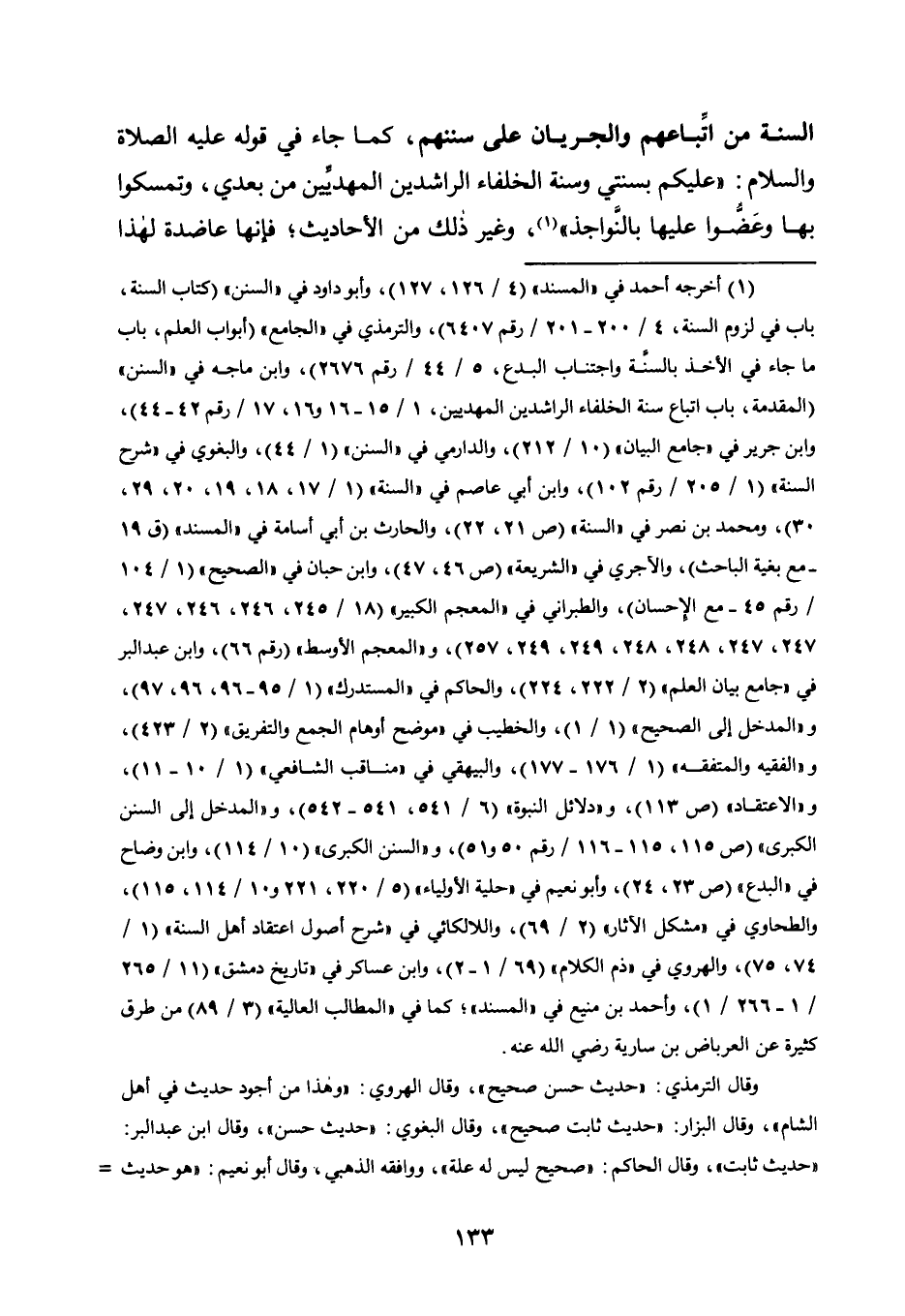 السُّنَّةِ مِنِ اتِّبَاعِهِمْ وَالْجَرَيَانِ عَلَى سُنَنِهِمْ، كَمَا جَاءَ فِي قَوْلِهِ, عَلَيْهِ الصَّلَاةُ وَالسَّلَامُ: "عَلَيْكُمْ بِسُنَّتِي وَسُنَّةِ الْخُلَفَاءِ الرَّاشِدِينَ الْمَهْدِيِّينَ مِنْ بَعْدِي، تمسكوا بِهَا وَعَضُّوا عَلَيْهَا بِالنَّوَاجِذِ" 1، وَغَيْرِ ذَلِكَ مِنَ الأحاديث؛ فإنها عاضدة لهذا