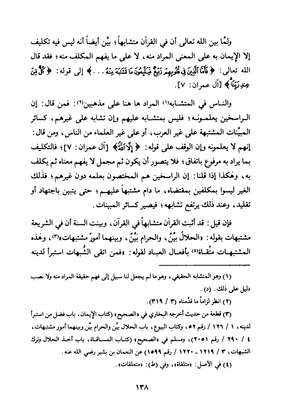 فَإِنْ قِيلَ: قَدْ أَثْبَتَ الْقُرْآنُ مُتَشَابِهًا فِي الْقُرْآنِ، وَبَيَّنَتِ السُّنَّةُ أَنَّ فِي الشَّرِيعَةِ مُشْتَبِهَاتٍ بِقَوْلِهِ: "الْحَلَالُ بَيِّنٌ، وَالْحَرَامُ بَيِّنٌ، وَبَيْنَهُمَا أُمُورٌ مُشْتَبِهَاتٌ" 3، وَهَذِهِ الْمُشْتَبِهَاتُ مُتَّقَاةٌ4 بِأَفْعَالِ الْعِبَادِ لِقَوْلِهِ: "فَمَنِ اتَّقَى الشُّبَهَاتِ استبرأ لدينه