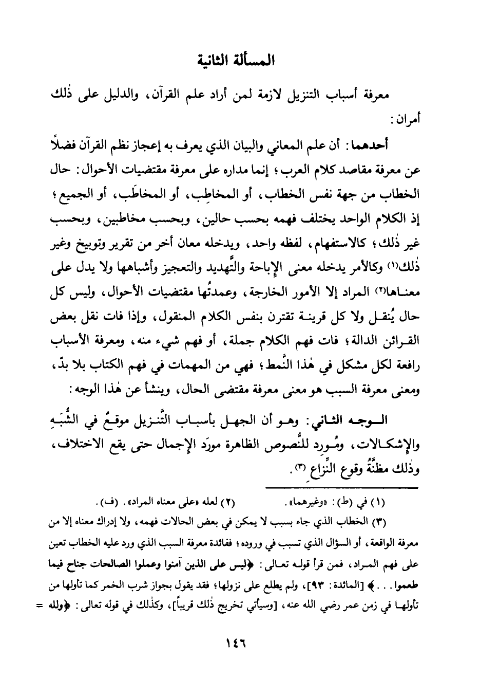 أَحَدُهُمَا: أَنَّ عِلْمَ الْمَعَانِي وَالْبَيَانِ الَّذِي يُعْرَفُ بِهِ إِعْجَازُ نَظْمِ الْقُرْآنِ فَضْلًا عَنْ مَعْرِفَةِ مَقَاصِدِ كَلَامِ الْعَرَبِ؛ إِنَّمَا مَدَارُهُ عَلَى مَعْرِفَةِ مُقْتَضَيَاتِ الْأَحْوَالِ: حَالِ الْخِطَابِ مِنْ جِهَةِ نَفْسِ الْخِطَابِ، أَوِ المخاطِب، أَوِ المخاطَب، أَوِ الْجَمِيعِ؛ إِذِ الْكَلَامُ الْوَاحِدُ يَخْتَلِفُ فَهْمُهُ بِحَسَبِ حَالَيْنِ، وَبِحَسَبِ مُخَاطَبَيْنِ، وَبِحَسَبِ غَيْرِ ذَلِكَ؛ كَالِاسْتِفْهَامِ، لَفْظُهُ وَاحِدٌ، وَيَدْخُلُهُ مَعَانٍ أُخَرُ مِنْ تَقْرِيرٍ وَتَوْبِيخٍ وَغَيْرِ ذَلِكَ1 وَكَالْأَمْرِ يَدْخُلُهُ مَعْنَى الْإِبَاحَةِ وَالتَّهْدِيدِ وَالتَّعْجِيزِ وَأَشْبَاهِهَا وَلَا يَدُلُّ عَلَى مَعْنَاهَا2 الْمُرَادِ إِلَّا الْأُمُورُ الْخَارِجَةُ، وَعُمْدَتُهَا مُقْتَضَيَاتُ الْأَحْوَالِ، وَلَيْسَ كُلُّ حَالٍ يُنْقَلُ وَلَا كُلُّ قَرِينَةٍ تَقْتَرِنُ بِنَفْسِ الْكَلَامِ الْمَنْقُولِ، وَإِذَا فَاتَ نَقْلُ بَعْضِ الْقَرَائِنِ الدَّالَّةِ؛ فَاتَ فَهْمُ الْكَلَامِ جُمْلَةً، أَوْ فَهْمُ شَيْءٍ مِنْهُ، وَمَعْرِفَةُ الْأَسْبَابِ رَافِعَةٌ لِكُلِّ مُشْكِلٍ فِي هَذَا النَّمَطِ؛ فَهِيَ مِنَ الْمُهِمَّاتِ في فهم الكتاب بلا بد، وَمَعْنَى مَعْرِفَةِ السَّبَبِ هُوَ مَعْنَى مَعْرِفَةِ مُقْتَضَى الْحَالِ، وَيَنْشَأُ عَنْ هَذَا الْوَجْهِ: