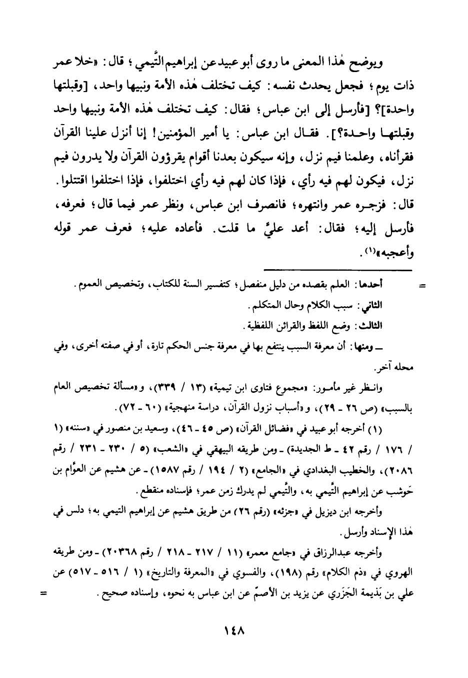 وَيُوَضِّحُ هَذَا الْمَعْنَى مَا رَوَى أَبُو عُبَيْدٍ عَنْ إِبْرَاهِيمَ التَّيْمِيِّ؛ قَالَ: "خَلَا عُمَرُ ذَاتَ يَوْمٍ؛ فَجَعَلَ يُحَدِّثُ نَفْسَهُ: كَيْفَ تَخْتَلِفُ هَذِهِ الْأُمَّةُ وَنَبِيُّهَا وَاحِدٌ، [وَقِبْلَتُهَا وَاحِدَةٌ] ؟ [فَأَرْسَلَ إِلَى ابْنِ عَبَّاسٍ؛ فَقَالَ: كَيْفَ تَخْتَلِفُ هَذِهِ الْأُمَّةُ وَنَبِيُّهَا وَاحِدٌ وَقِبْلَتُهَا وَاحِدَةٌ؟] . فَقَالَ: ابْنُ عَبَّاسٍ: يَا أَمِيرَ الْمُؤْمِنِينَ! إِنَّا أُنْزِلَ عَلَيْنَا الْقُرْآنُ فقرأناه، وعلمنا فيما نَزَلَ، وَإِنَّهُ سَيَكُونُ بَعْدَنَا أَقْوَامٌ يَقْرَءُونَ الْقُرْآنَ ولا يدرون فيما نَزَلَ، فَيَكُونُ لَهُمْ فِيهِ رَأْيٌ، فَإِذَا كَانَ لَهُمْ فِيهِ رَأْيٌ اخْتَلَفُوا، فَإِذَا اخْتَلَفُوا اقْتَتَلُوا. قَالَ: فَزَجَرَهُ عُمَرُ وَانْتَهَرَهُ؛ فَانْصَرَفَ ابْنُ عَبَّاسٍ، وَنَظَرَ عُمَرُ فِيمَا قَالَ؛، فَعَرَفَهُ فَأَرْسَلَ إِلَيْهِ؛ فَقَالَ: أَعِدْ عَلَيَّ مَا قُلْتَ. فَأَعَادَهُ عَلَيْهِ؛ فعرف عمر قوله وأعجبه"1.