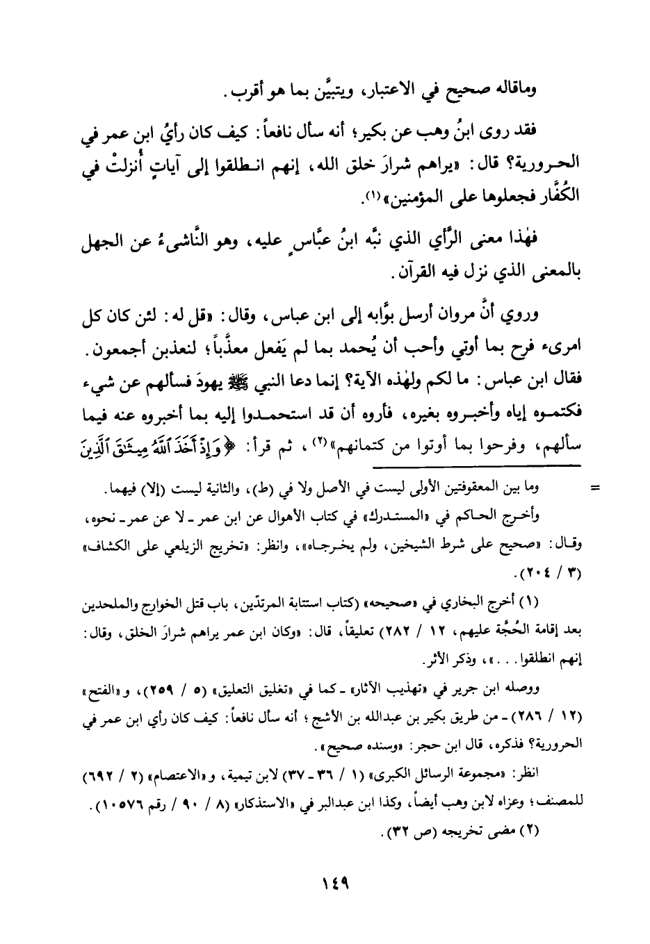 ووصله ابن جرير في "تهذيب الآثار" -كما في "تغليق التعليق" "5/ 259"، و"الفتح" "12/ 286"- من طريق بكير بن عبد الله بن الأشج؛ أَنَّهُ سَأَلَ نَافِعًا: كَيْفَ كَانَ رَأْيُ ابْنِ عمر في الحرورية؟ فذكره، قال ابن حجر: "وسنده صحيح".