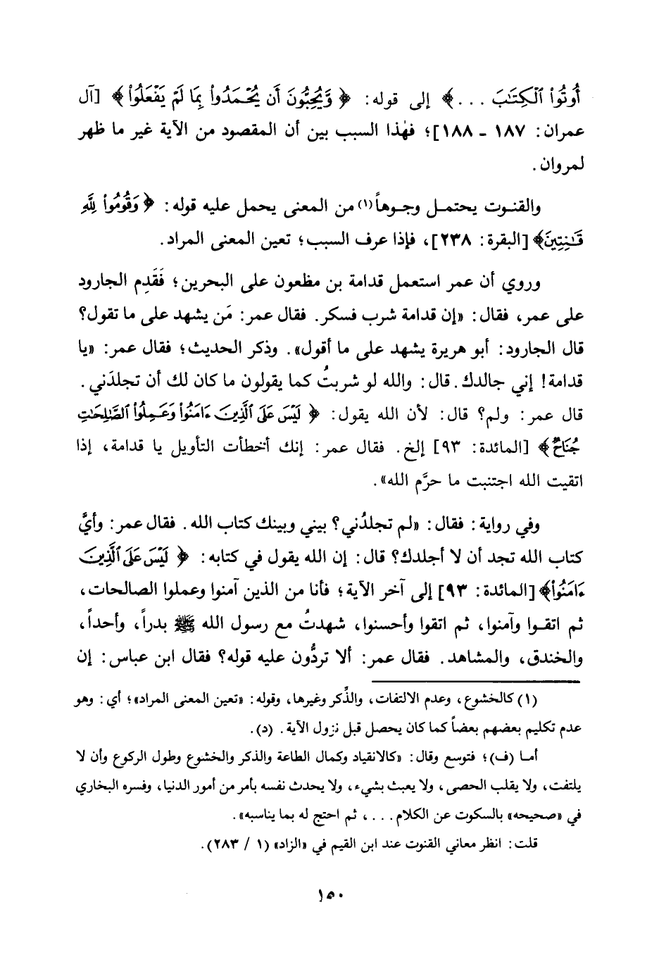 وَالْقُنُوتُ يَحْتَمِلُ وُجُوهًا1 مِنَ الْمَعْنَى يُحْمَلُ عَلَيْهِ قَوْلُهُ: {وَقُومُوا لِلَّهِ قَانِتِين} [الْبَقَرَةِ: 238] ، فَإِذَا عُرِفَ السَّبَبُ؛ تَعَيَّنَ الْمَعْنَى الْمُرَادُ.