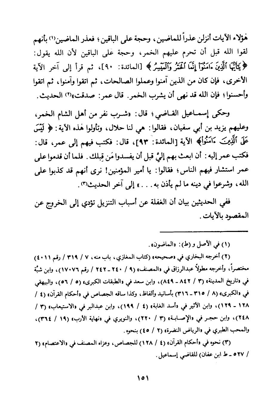 وَحَكَى إِسْمَاعِيلُ الْقَاضِي؛ قَالَ: "شَرِبَ نَفَرٌ مِنْ أَهْلِ الشَّامِ الْخَمْرَ، وَعَلَيْهِمْ يَزِيدُ بْنُ أَبِي سُفْيَانَ، فَقَالُوا: هِيَ لَنَا حَلَالٌ، وَتَأَوَّلُوا هَذِهِ الْآيَةَ: {لَيْسَ عَلَى الَّذِينَ آمَنُوا} الآية [المائدة: 93] ، قَالَ: فَكَتَبَ فِيهِمْ إِلَى عُمَرَ، قَالَ: فَكَتَبَ عُمَرُ إِلَيْهِ: أَنِ ابْعَثْ بِهِمْ إِلَيَّ قَبْلَ أَنْ يُفْسِدُوا مَنْ قِبَلَكَ. فَلَمَّا أَنْ قَدِمُوا عَلَى عُمَرَ اسْتَشَارَ فِيهِمُ النَّاسَ؛ فَقَالُوا: يَا أَمِيرَ الْمُؤْمِنِينَ! نَرَى أَنَّهُمْ قَدْ كَذَبُوا عَلَى اللَّهِ، وَشَرَعُوا فِي دِينِهِ مَا لَمْ يَأْذَنْ بِهِ...." إِلَى آخِرِ الْحَدِيثِ3.