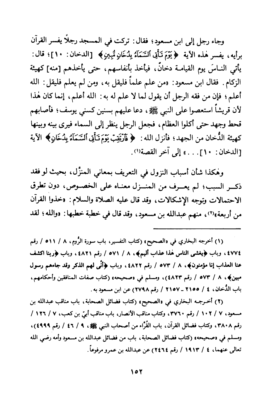 وهذا شَأْنُ أَسْبَابِ النُّزُولِ فِي التَّعْرِيفِ بِمَعَانِي الْمُنَزَّلِ، بِحَيْثُ لَوْ فُقِدَ ذِكْرُ السَّبَبِ؛ لَمْ يُعْرَفْ مِنَ الْمُنَزَّلِ مَعْنَاهُ عَلَى الْخُصُوصِ، دُونَ تَطَرُّقِ الِاحْتِمَالَاتِ وَتَوَجُّهِ الْإِشْكَالَاتِ، وَقَدْ قَالَ, عَلَيْهِ الصَّلَاةُ وَالسَّلَامُ: "خُذُوا الْقُرْآنَ مِنْ أَرْبَعَةٍ" 2، مِنْهُمْ عَبْدُ اللَّهِ بْنُ مَسْعُودٍ، وَقَدْ قَالَ فِي خُطْبَةٍ خطبها: "والله؛ لقد