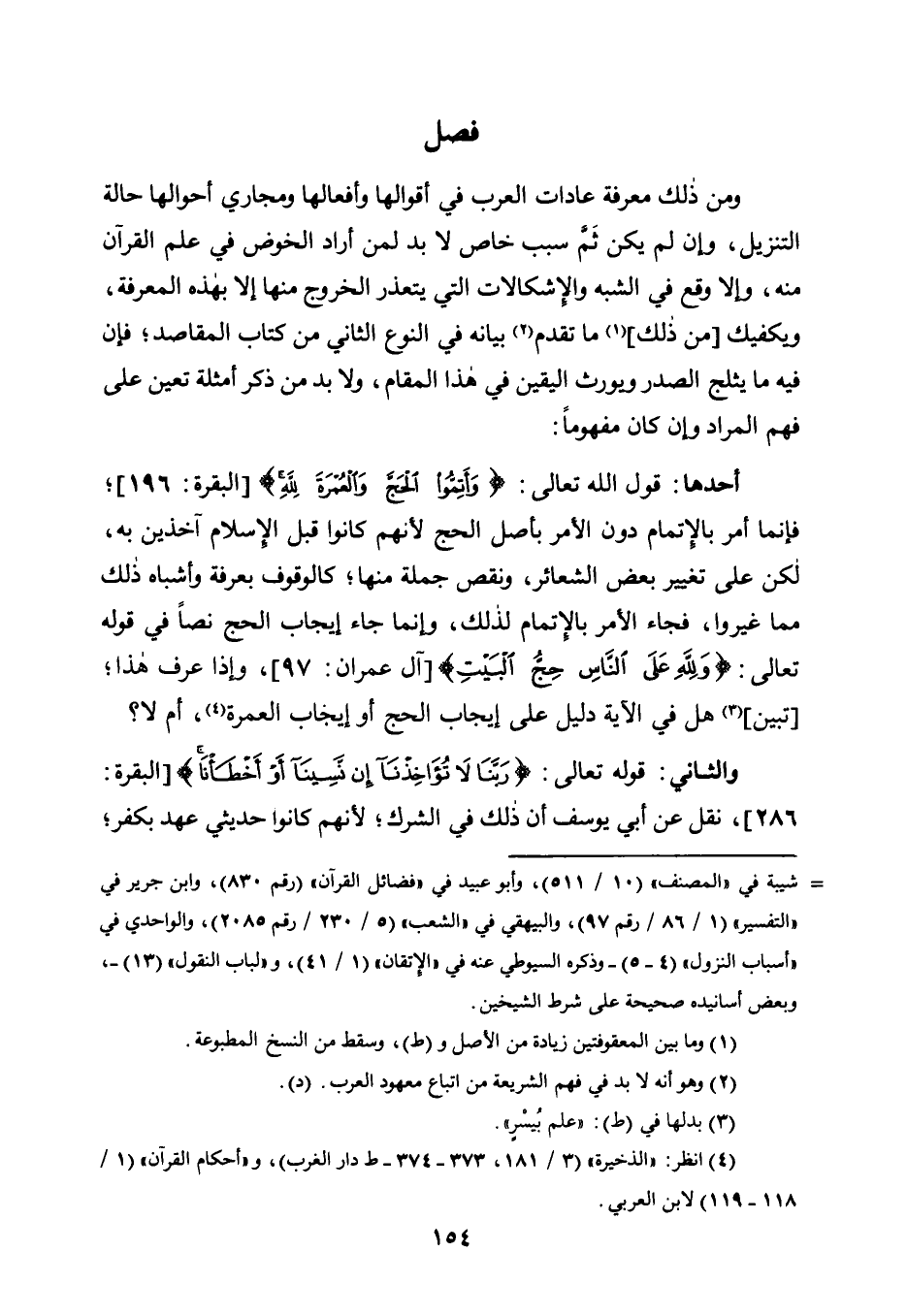 وَمِنْ ذَلِكَ مَعْرِفَةُ عَادَاتِ الْعَرَبِ فِي أَقْوَالِهَا وَأَفْعَالِهَا وَمَجَارِي أَحْوَالِهَا حَالَةَ التَّنْزِيلِ، وَإِنْ لم يكن ثم سبب خاص لا بد لِمَنْ أَرَادَ الْخَوْضَ فِي عِلْمِ الْقُرْآنِ مِنْهُ، وَإِلَّا وَقَعَ فِي الشُّبَهِ وَالْإِشْكَالَاتِ الَّتِي يُتَعَذَّرُ الْخُرُوجُ مِنْهَا إِلَّا بِهَذِهِ الْمَعْرِفَةِ، وَيَكْفِيكَ [مِنْ ذَلِكَ] 1 مَا تَقَدَّمَ2 بَيَانُهُ فِي النَّوْعِ الثَّانِي مِنْ كِتَابِ الْمَقَاصِدِ؛ فَإِنَّ فِيهِ مَا يُثْلِجُ الصدر ويورث اليقين في هذا المقام، ولا بد مِنْ ذِكْرِ أَمْثِلَةٍ تُعِينُ عَلَى فَهْمِ الْمُرَادِ وَإِنْ كَانَ مَفْهُومًا: