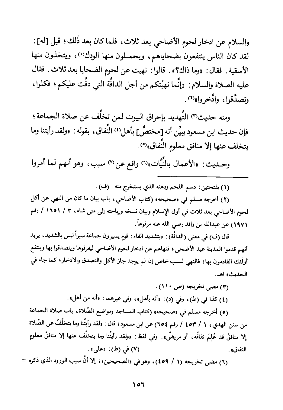 2 أخرجه مسلم في "صحيحه" "كتاب الأضاحي، باب بيان ما كان من النهي عن أكل لحوم الأضاحي بعد ثلاث في أول الإسلام وبيان نسخه وإباحته إلى متى شاء، 3/ 1651/ رقم 1971" عن عبد الله بن واقد -رضي الله عنه- مرفوعًا.
