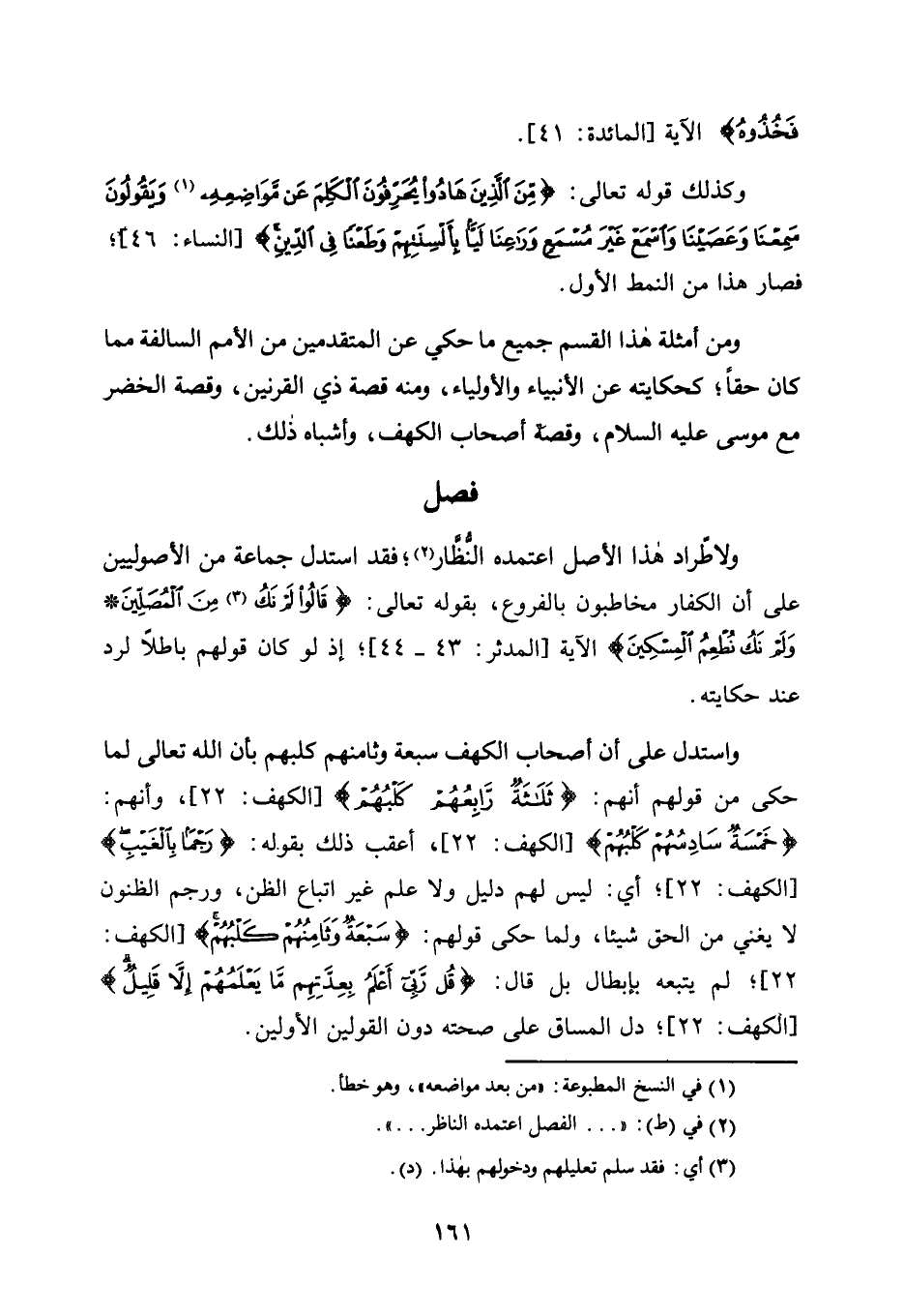 وَلِاطِّرَادِ هَذَا الْأَصْلِ اعْتَمَدَهُ النُّظَّارُ3؛ فَقَدِ اسْتَدَلَّ جَمَاعَةٌ مِنَ الْأُصُولِيِّينَ عَلَى أَنَّ الْكُفَّارَ مُخَاطَبُونَ بِالْفُرُوعِ، بِقَوْلِهِ تَعَالَى: {قَالُوا لَمْ نَكُ مِنَ الْمُصَلِّينَ، وَلَمْ نَكُ نُطْعِمُ الْمِسْكِينَ} 4 الْآيَةَ [الْمُدَّثِّرِ: 43-44] ؛ إِذْ لَوْ كَانَ قَوْلُهُمْ بَاطِلًا لَرُدَّ عِنْدَ حِكَايَتِهِ.