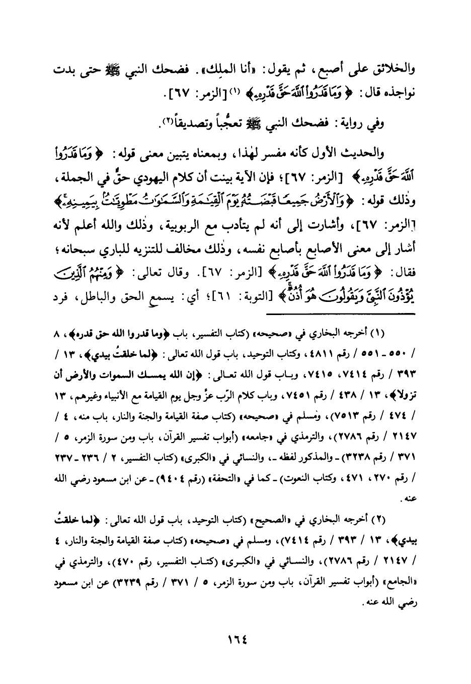1 أخرجه البخاري في "صحيحه" "كتاب التفسير، باب {وَمَا قَدَرُوا اللَّهَ حَقَّ قَدْرِهِ} ، 8/ 550-551/ رقم 4811، وكتاب التوحيد، باب قول الله تعالى: {لِمَا خَلَقْتُ بِيَدَي} , 13/ 393/ رقم 7414، 7415، وباب قول الله تعالى: {إِنَّ اللَّهَ يُمْسِكُ السَّمَاوَاتِ وَالْأَرْضَ أَنْ تَزُولا} ، 13/ 438/ رقم 7451، وباب كلام الرب -عز وجل- يوم القيامة مع الأنبياء وغيرهم، 13/ 474/ رقم 7513"، ومسلم في "صحيحه" "كتاب صفة القيامة والجنة والنار، باب منه، 4/ 2147/ رقم 2786"، والترمذي في "جامعه" "أبواب تفسير القرآن، باب ومن سورة الزمر، 5/ 371/ رقم 3238" والمذكور لفظه، والنسائي في "الكبرى" "كتاب التفسير، 2/ 236-237/ رقم 270-471، وكتاب النعوت" -كما في "التحفة" "رقم 9404"- عن ابن مسعود, رضي الله عنه.