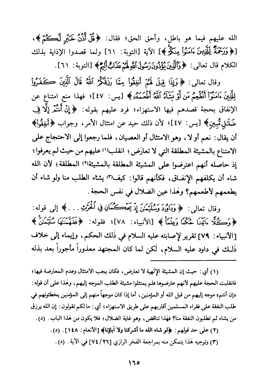 وَقَالَ تَعَالَى: {وَإِذَا قِيلَ لَهُمْ أَنْفِقُوا مِمَّا رَزَقَكُمُ اللَّهُ قَالَ الَّذِينَ كَفَرُوا لِلَّذِينَ آمَنُوا أَنُطْعِمُ مَنْ لَوْ يَشَاءُ اللَّهُ أَطْعَمَهُ} [يس: 47] ؛ فَهَذَا مَنْعُ امْتِنَاعٍ عَنِ الْإِنْفَاقِ بِحُجَّةِ قَصْدِهِمْ فِيهَا الِاسْتِهْزَاءِ؛ فَرَدَّ عَلَيْهِمْ بِقَوْلِهِ: {إِنْ أَنْتُمْ إِلَّا فِي ضَلالٍ مُبِينٍ} [يس: 47] ؛ لِأَنَّ ذَلِكَ حَيْدٌ عَنِ امْتِثَالِ الْأَمْرِ، وَجَوَابُ {أَنْفِقُوا} أَنْ يُقَالَ: نَعَمْ أَوْ لَا، وَهُوَ الِامْتِثَالُ أَوِ الْعِصْيَانُ، فَلَمَّا رَجَعُوا إِلَى الِاحْتِجَاجِ عَلَى الِامْتِنَاعِ بِالْمَشِيئَةِ الْمُطْلَقَةِ الَّتِي لَا تُعَارَضُ؛ انْقَلَبَ1 عَلَيْهِمْ مِنْ حَيْثُ لَمْ يَعْرِفُوا؛ إِذْ حَاصِلُهُ أَنَّهُمُ اعْتَرَضُوا عَلَى الْمَشِيئَةِ الْمُطْلَقَةِ؛ بِالْمَشِيئَةِ2 الْمُطْلَقَةِ؛ لِأَنَّ اللَّهَ شَاءَ أَنْ يُكَلِّفَهُمُ الْإِنْفَاقَ، فَكَأَنَّهُمْ قَالُوا: كَيْفَ3 يَشَاءُ الطَّلَبُ مِنَّا وَلَوْ شَاءَ أَنْ يُطْعِمَهُمْ لِأَطْعَمَهُمْ؟ وَهَذَا عَيْنُ الضَّلَالِ فِي نَفْسِ الْحُجَّةِ.