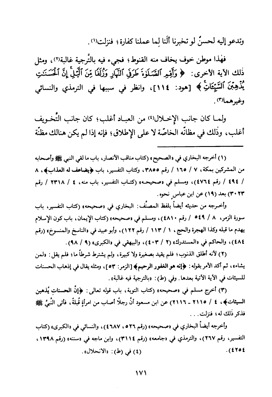 فَهَذَا مَوْطِنُ خَوْفٍ يُخَافُ مِنْهُ الْقُنُوطُ؛ فَجِيءَ فِيهِ بِالتَّرْجِيَةِ غَالِبَةً2، وَمِثْلُ ذَلِكَ الْآيَةُ الْأُخْرَى: {وَأَقِمِ الصَّلاةَ طَرَفَيِ النَّهَارِ وَزُلَفًا مِنَ اللَّيْلِ إِنَّ الْحَسَنَاتِ يُذْهِبْنَ السَّيِّئَاتِ} [هُودٍ: 114] ، وَانْظُرْ فِي سَبَبِهَا فِي التِّرْمِذِيِّ وَالنَّسَائِيِّ وَغَيْرِهِمَا3.