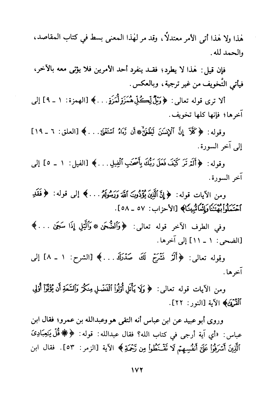 أَلَا تَرَى قَوْلَهُ تَعَالَى: {وَيْلٌ لِكُلِّ هُمَزَةٍ لُمَزَةٍ ... } [الْهَمْزَةِ: 1-9] إِلَى آخِرِهَا؛ فَإِنَّهَا كُلَّهَا تَخْوِيفٌ.