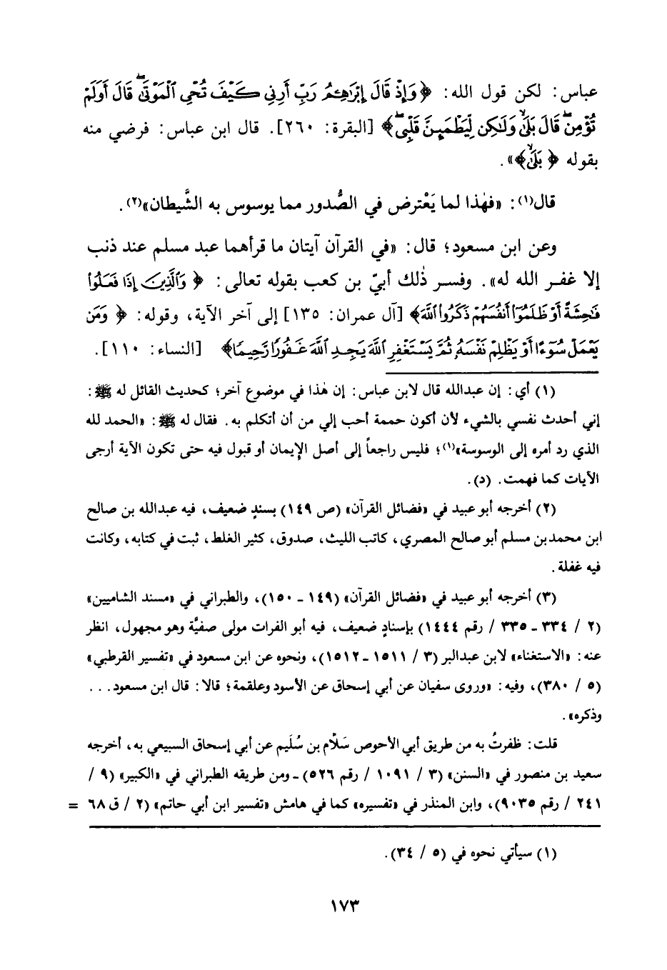 عَبَّاسٍ: لَكِنَّ قَوْلَ اللَّهِ: {وَإِذْ قَالَ إِبْرَاهِيمُ رَبِّ أَرِنِي كَيْفَ تُحْيِي الْمَوْتَى قَالَ أَوَلَمْ تُؤْمِنْ قَالَ بَلَى وَلَكِنْ لِيَطْمَئِنَّ قَلْبِي} [الْبَقَرَةِ: 260] . قَالَ ابْنُ عَبَّاسٍ: فَرَضِيَ مِنْهُ بِقَوْلِهِ: {بَلَى} ".