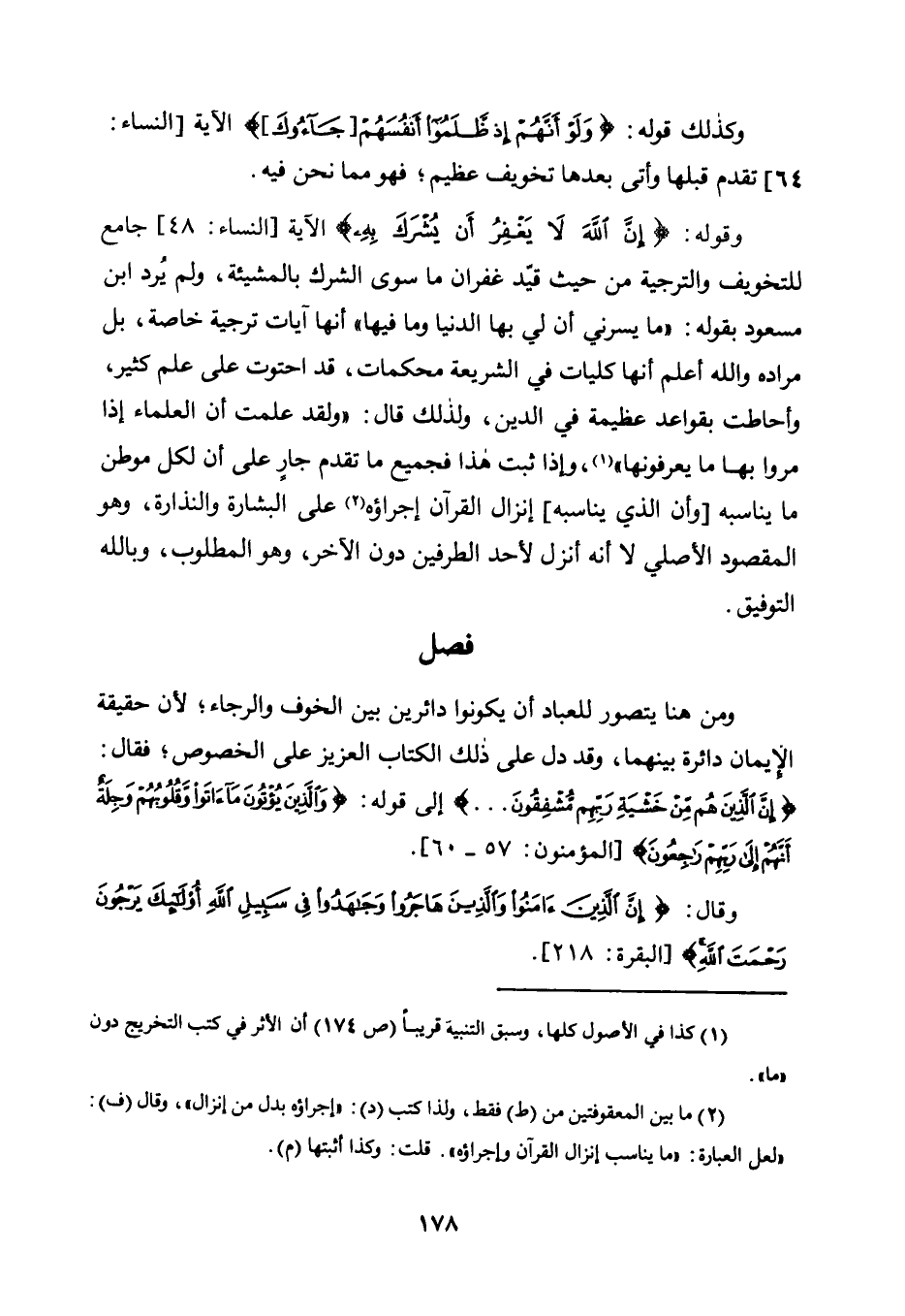 وَقَوْلُهُ: {إِنَّ اللَّهَ لَا يَغْفِرُ أَنْ يُشْرَكَ بِهِ} الْآيَةَ [النِّسَاءِ: 48] جَامِعٌ لِلتَّخْوِيفِ وَالتَّرْجِيَةِ مِنْ حَيْثُ قَيَّدَ غُفْرَانَ مَا سِوَى الشِّرْكِ بِالْمَشِيئَةِ، وَلَمْ يُرِدِ ابْنُ مَسْعُودٍ بِقَوْلِهِ: "مَا يَسُرُّنِي أَنَّ لِي بِهَا الدُّنْيَا وَمَا فِيهَا" أَنَّهَا آيَاتُ تَرْجِيَةٍ خَاصَّةٍ، بَلْ مُرَادُهُ وَاللَّهُ أَعْلَمُ أَنَّهَا كُلِّيَّاتٌ فِي الشَّرِيعَةِ مُحْكَمَاتٌ، قَدِ احْتَوَتْ عَلَى عِلْمٍ كَثِيرٍ، وَأَحَاطَتْ بِقَوَاعِدَ عَظِيمَةٍ فِي الدِّينِ، وَلِذَلِكَ قَالَ: "وَلَقَدْ عَلِمْتُ أَنَّ الْعُلَمَاءَ إِذَا مَرُّوا بِهَا مَا يَعْرِفُونَهَا"2، وَإِذَا ثَبَتَ هَذَا فَجَمِيعُ مَا تَقَدَّمَ جَارٍ عَلَى أَنَّ لِكُلِّ مَوْطِنٍ ما يناسبه [وإن الذي يُنَاسِبُهُ] إِنْزَالُ الْقُرْآنِ إِجْرَاؤُهُ3 عَلَى الْبِشَارَةِ وَالنِّذَارَةِ، وَهُوَ الْمَقْصُودُ الْأَصْلِيُّ لَا أَنَّهُ أُنْزِلَ لِأَحَدِ الطَّرَفَيْنِ دُونَ الْآخَرِ، وَهُوَ الْمَطْلُوبُ، وَبِاللَّهِ التَّوْفِيقُ.
