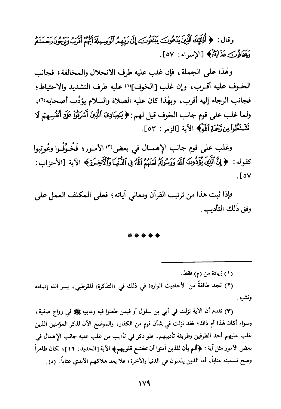 فَإِذَا ثَبَتَ هَذَا مِنْ تَرْتِيبِ الْقُرْآنِ وَمَعَانِي آيَاتِهِ؛ فَعَلَى الْمُكَلَّفِ الْعَمَلُ على وفق ذلك التأديب.
