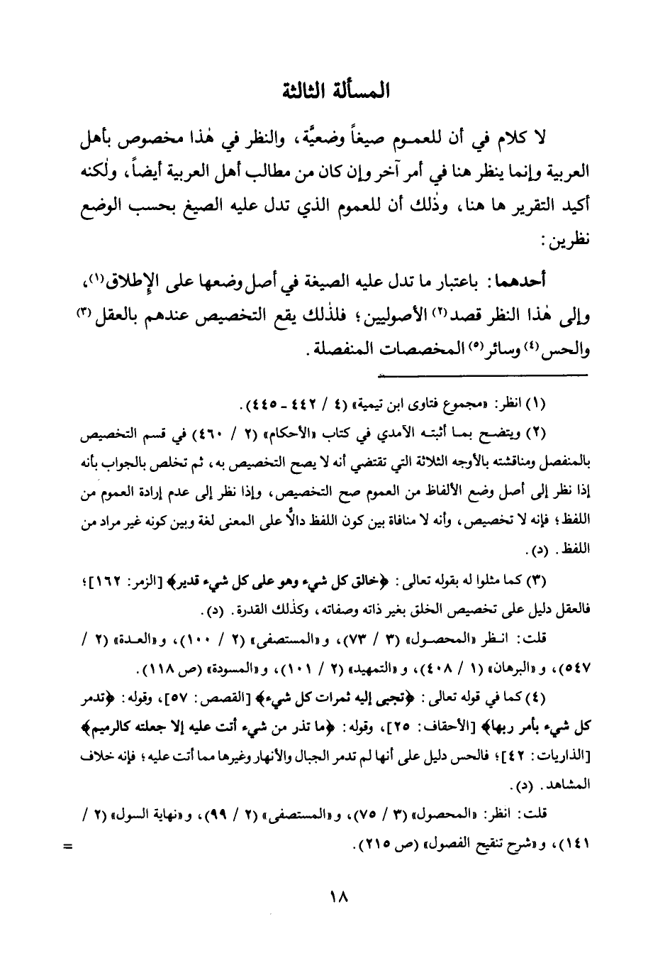 قلت: انظر "المحصول" "3/ 73"، و"المستصفى" "2/ 100"، و"العدة" "2/ 547"، و"البرهان" "1/ 408"، و"التمهيد" "2/ 101"، و"المسودة" "ص118".