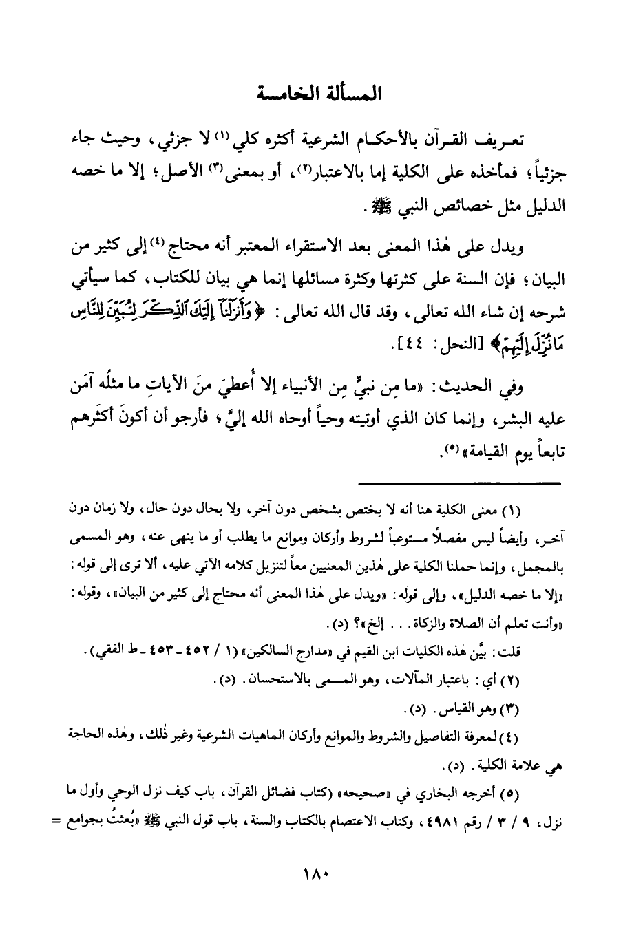 تَعْرِيفُ الْقُرْآنِ بِالْأَحْكَامِ الشَّرْعِيَّةِ أَكْثَرُهُ كُلِّيٌّ1 لَا جُزْئِيٌّ، وَحَيْثُ جَاءَ جُزْئِيًّا؛ فَمَأْخَذُهُ عَلَى الْكُلِّيَّةِ إِمَّا بِالِاعْتِبَارِ2، أَوْ بِمَعْنَى3 الْأَصْلِ؛ إِلَّا مَا خَصَّهُ الدَّلِيلُ مِثْلَ خَصَائِصِ النَّبِيِّ, صَلَّى اللَّهُ عَلَيْهِ وَسَلَّمَ.