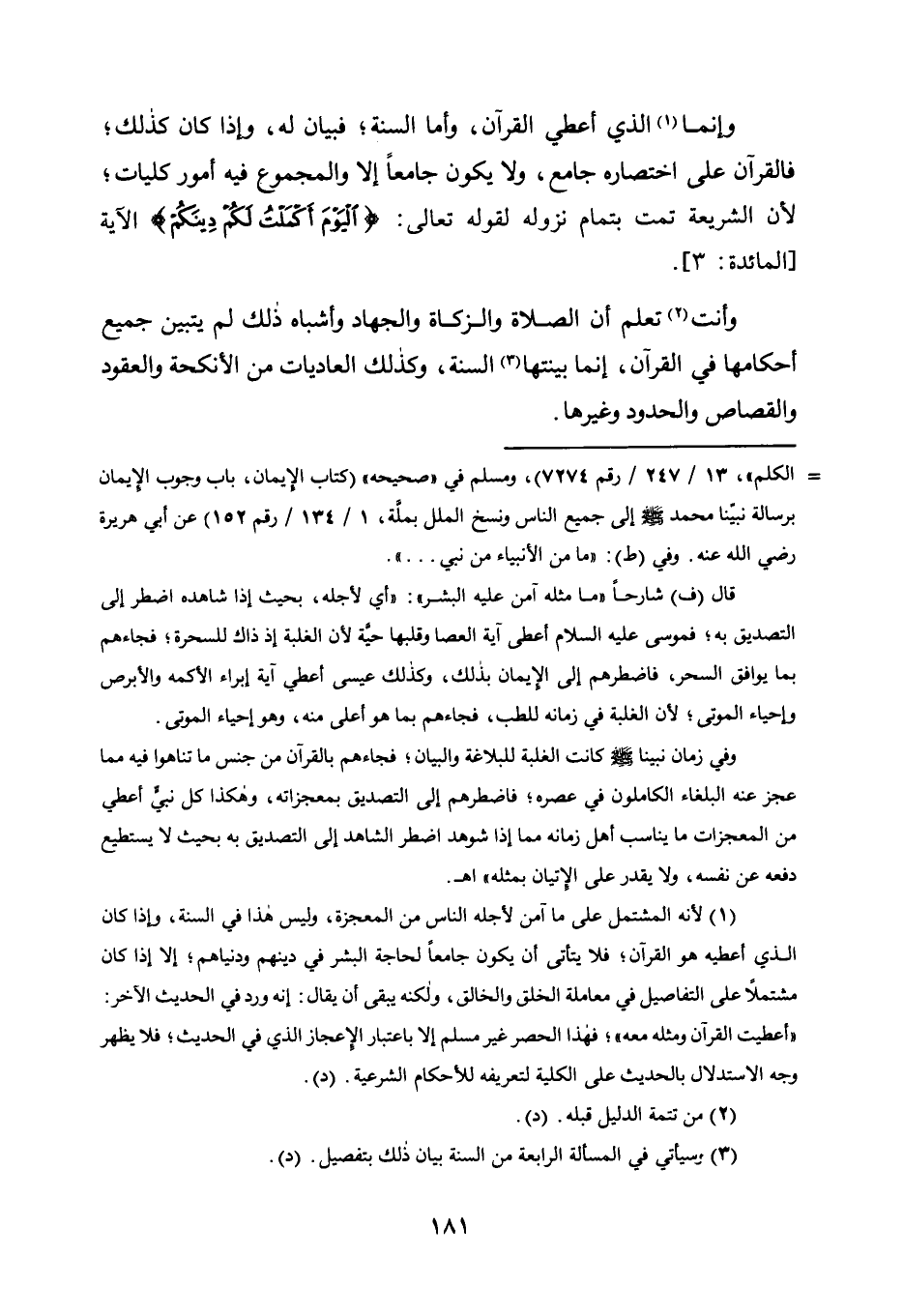 1 لأنه المشتمل على ما آمن لأجله الناس من المعجزة، وليس هذا في السنة، وإذا كان الذي أعطيه هو القرآن؛ فلا يتأتى أن يكون جامعًا لحاجة البشر في دينهم ودنياهم؛ إلا إذا كان مشتملًا على التفاصيل في معاملة الخلق والخالق، ولكنه يبقى أن يقال: إنه ورد في الحديث الآخر: "أعطيت القرآن ومثله معه"؛ فهذا الحصر غير مسلم إلا باعتبار الإعجاز الذي في الحديث؛ فلا يظهر وجه الاستدلال بالحديث على الكلية لتعريفه للأحكام الشرعية. "د".