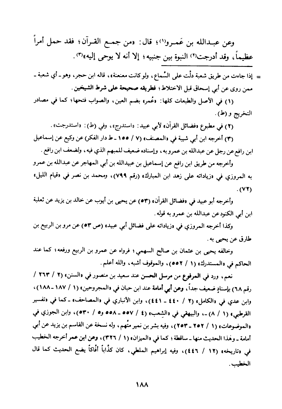 وأخرجه أبو عبيد في "فضائل القرآن" "53" عن يحيى بن أيوب عن خالد بن يزيد عن ثعلبة بن أبي الكنود عن عبد الله بن عمرو به قوله.