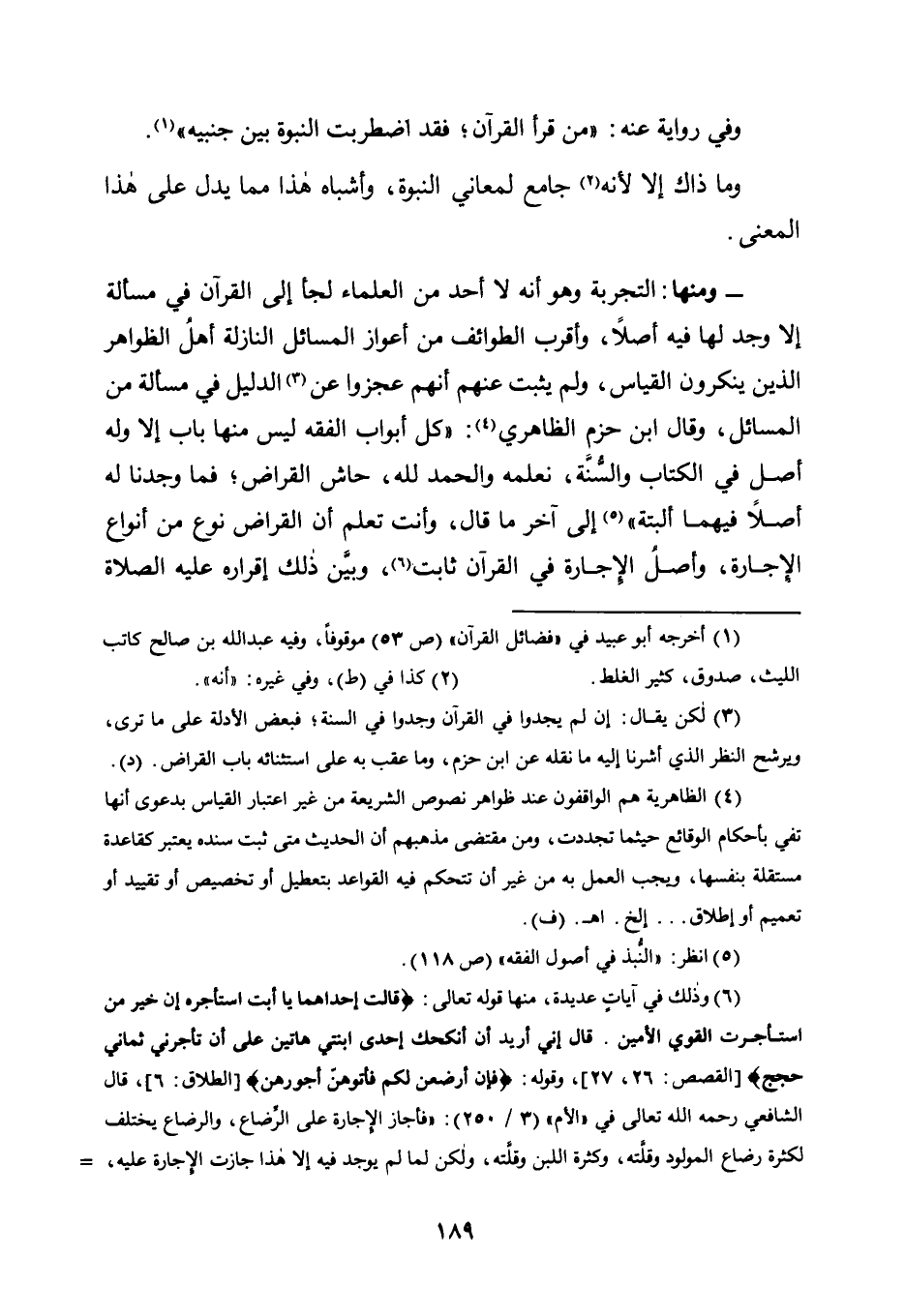 - وَمِنْهَا: التَّجْرِبَةُ وَهُوَ أَنَّهُ لَا أَحَدَ مِنَ الْعُلَمَاءِ لَجَأَ إِلَى الْقُرْآنِ فِي مَسْأَلَةٍ إِلَّا وَجَدَ لَهَا فِيهِ أَصْلًا، وَأَقْرَبُ الطَّوَائِفِ مِنْ إِعْوَازِ الْمَسَائِلِ النَّازِلَةِ أَهْلُ الظَّوَاهِرِ الَّذِينَ يُنْكِرُونَ الْقِيَاسَ، وَلَمْ يَثْبُتْ عَنْهُمْ أَنَّهُمْ عَجَزُوا عَنِ3 الدَّلِيلِ فِي مَسْأَلَةٍ مِنَ الْمَسَائِلِ، وَقَالَ ابْنُ حَزْمِ الظَّاهِرِيِّ4: "كُلُّ أَبْوَابِ الْفِقْهِ لَيْسَ مِنْهَا بَابٌ إِلَّا وَلَهُ أَصْلٌ فِي الْكِتَابِ وَالسُّنَّةِ، نَعْلَمُهُ وَالْحَمْدُ لِلَّهِ، حَاشَ الْقِرَاضَ؛ فَمَا وَجَدْنَا لَهُ أَصْلًا فِيهِمَا أَلْبَتَّةَ"5 إِلَى آخِرِ مَا قَالَ، وَأَنْتَ تَعْلَمُ أَنَّ الْقِرَاضَ نَوْعٌ مِنْ أَنْوَاعِ الْإِجَارَةِ, وَأَصْلُ الْإِجَارَةِ، فِي الْقُرْآنِ ثَابِتٌ6، وَبَيَّنَ ذَلِكَ إِقْرَارُهُ عَلَيْهِ الصلاة