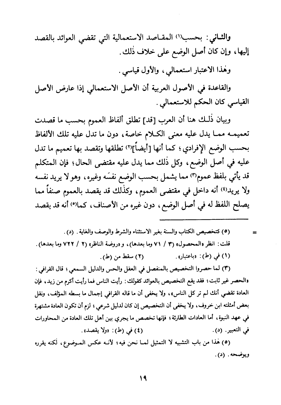 3 لما حصروا التخصيص بالمنفصل في العقل والحس والدليل السمعي؛ قال القرافي: "الحصر غير ثابت؛ فقد يقع التخصيص بالعوائد كقولك: رأيت الناس فما رأيت أكرم من زيد، فإن العادة تقضي أنك لم تر كل الناس"، ولا يخفى أن ما قاله القرافي إجمال ما بسطه المؤلف، ونقل بعض أمثلته ابن خروف، ولا يخفى أن التخصيص إن كان لدليل شرعي؛ لزم أن تكون العادة مشتهرة في عهد النبوة، أما العادات الطارئة؛ فإنها تخصص ما يجري بين أهل تلك العادة من المحاورات في التعبير. "د".