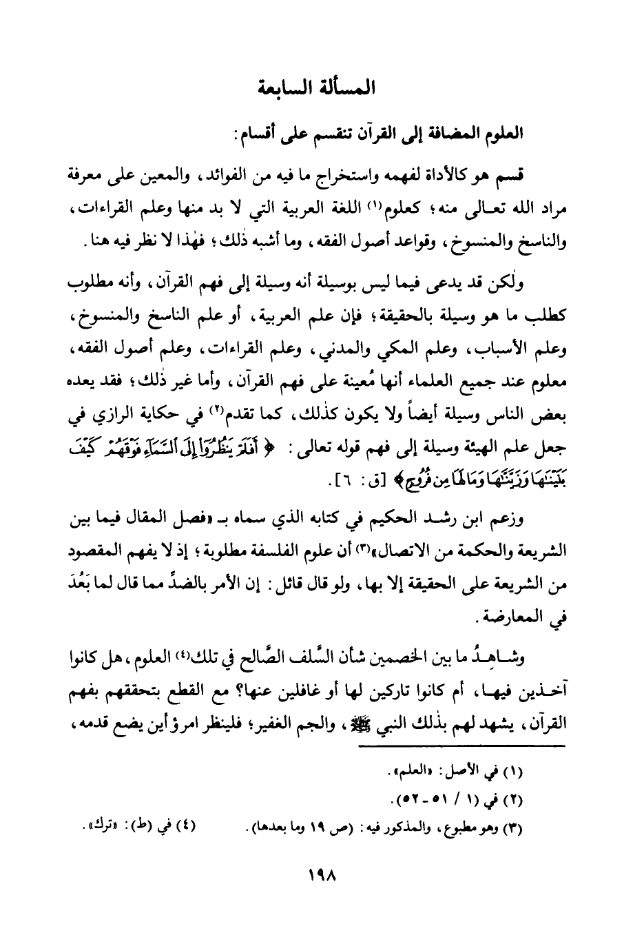 وَلَكِنْ قَدْ يُدَّعَى فِيمَا لَيْسَ بِوَسِيلَةٍ أَنَّهُ وَسِيلَةٌ إِلَى فَهْمِ الْقُرْآنِ، وَأَنَّهُ مَطْلُوبٌ كَطَلَبِ مَا هُوَ وَسِيلَةٌ بِالْحَقِيقَةِ، فَإِنَّ عِلْمَ الْعَرَبِيَّةِ، أَوْ عِلْمَ النَّاسِخِ وَالْمَنْسُوخِ، وَعِلْمَ الْأَسْبَابِ، وَعِلْمَ الْمَكِّيِّ وَالْمَدَنِيِّ، وَعِلْمَ الْقِرَاءَاتِ، وَعِلْمَ أُصُولِ الْفِقْهِ، مَعْلُومٌ عِنْدَ جَمِيعِ الْعُلَمَاءِ أَنَّهَا مُعِينَةٌ عَلَى فَهْمِ الْقُرْآنِ، وَأَمَّا غَيْرُ ذَلِكَ؛ فَقَدْ يَعُدُّهُ بَعْضُ النَّاسِ وَسِيلَةً أَيْضًا وَلَا يَكُونُ كَذَلِكَ، كَمَا تَقَدَّمَ2 فِي حِكَايَةِ الرَّازِيِّ فِي جَعْلِ عِلْمِ الْهَيْئَةِ وَسِيلَةً إِلَى فَهْمِ قَوْلُهُ تَعَالَى: {أَفَلَمْ يَنْظُرُوا إِلَى السَّمَاءِ فَوْقَهُمْ كَيْفَ بَنَيْنَاهَا وَزَيَّنَّاهَا وَمَا لَهَا مِنْ فُرُوجٍ} [ق: 6] .