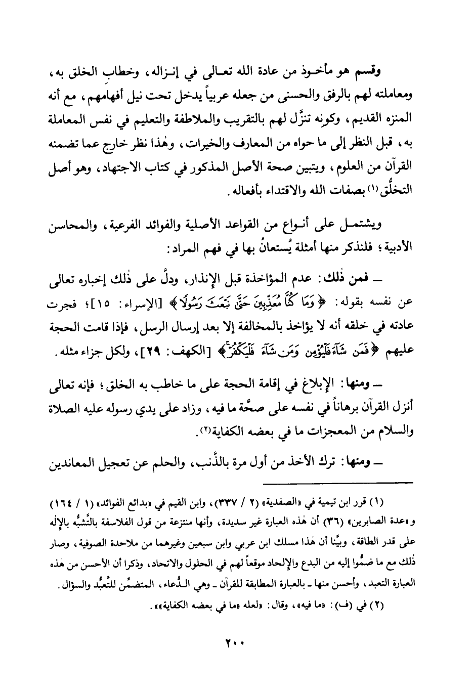 وَقِسْمٌ هُوَ مَأْخُوذٌ مِنْ عَادَةِ اللَّهِ تَعَالَى فِي إِنْزَالِهِ، وَخِطَابِ الْخَلْقِ بِهِ، وَمُعَامَلَتِهِ لَهُمْ بِالرِّفْقِ وَالْحُسْنَى مِنْ جَعْلِهِ عَرَبِيًّا يَدْخُلُ تَحْتَ نَيْلِ أَفْهَامِهِمْ، مَعَ أَنَّهُ الْمُنَزَّهُ الْقَدِيمُ، وَكَوْنُهُ تَنَزَّلَ لَهُمْ بِالتَّقْرِيبِ وَالْمُلَاطَفَةِ وَالتَّعْلِيمِ فِي نَفْسِ الْمُعَامَلَةِ بِهِ، قَبْلَ النَّظَرِ إِلَى مَا حَوَاهُ مِنَ الْمَعَارِفِ وَالْخَيْرَاتِ، وَهَذَا نَظَرٌ خَارِجٌ عَمَّا تَضَمَّنَهُ الْقُرْآنُ مِنَ الْعُلُومِ، وَيَتَبَيَّنُ صِحَّةُ الْأَصْلِ الْمَذْكُورِ فِي كِتَابِ الِاجْتِهَادِ، وَهُوَ أَصْلُ التَّخَلُّقِ1 بِصِفَاتِ اللَّهِ وَالِاقْتِدَاءِ بِأَفْعَالِهِ.