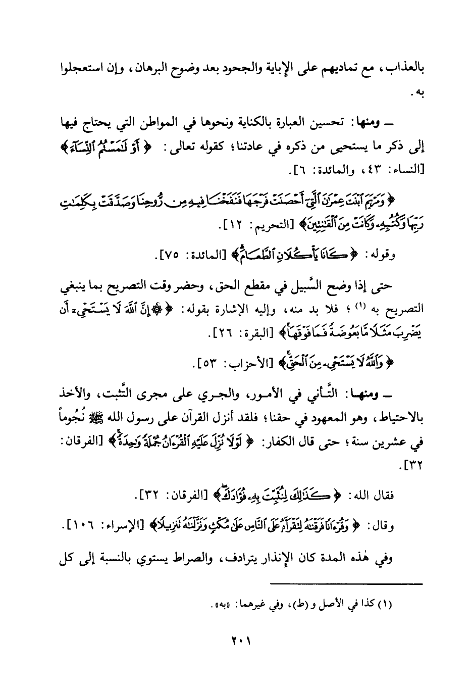 - وَمِنْهَا: التَّأَنِّي فِي الْأُمُورِ، وَالْجَرْيُ عَلَى مَجْرَى التَّثَبُّتِ، وَالْأَخْذُ بِالِاحْتِيَاطِ، وَهُوَ الْمَعْهُودُ فِي حَقِّنَا؛ فَلَقَدْ أُنْزِلَ الْقُرْآنُ عَلَى رَسُولِ اللَّهِ -صَلَّى اللَّهُ عَلَيْهِ وَسَلَّمَ- نُجُومًا فِي عِشْرِينَ سَنَةً؛ حَتَّى قَالَ الْكُفَّارُ: {لَوْلا نُزِّلَ عَلَيْهِ الْقُرْآنُ جُمْلَةً وَاحِدَةً} [الْفَرْقَانِ: 32] .