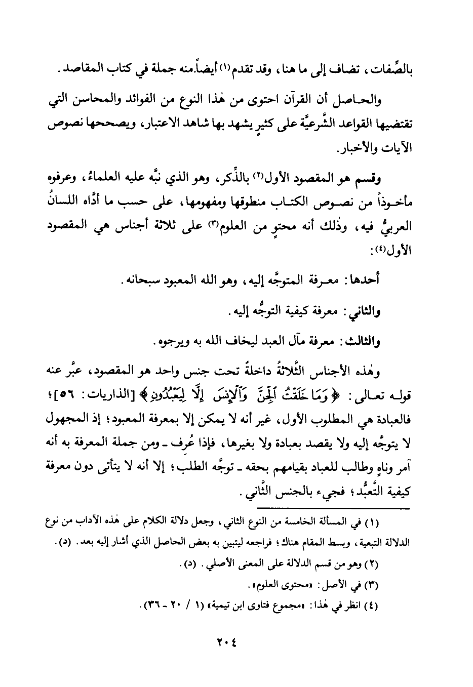 وَقِسْمٌ هُوَ الْمَقْصُودُ الْأَوَّلُ2 بِالذِّكْرِ، وَهُوَ الَّذِي نَبَّهَ عَلَيْهِ الْعُلَمَاءُ، وَعَرَفُوهُ مَأْخُوذًا مِنْ نُصُوصِ الْكِتَابِ مَنْطُوقِهَا وَمَفْهُومِهَا، عَلَى حَسَبِ مَا أَدَّاهُ اللِّسَانُ الْعَرَبِيُّ فِيهِ، وَذَلِكَ أَنَّهُ محتوٍ مِنَ الْعُلُومِ3 عَلَى ثَلَاثَةِ أَجْنَاسٍ هِيَ الْمَقْصُودُ الْأَوَّلُ4: