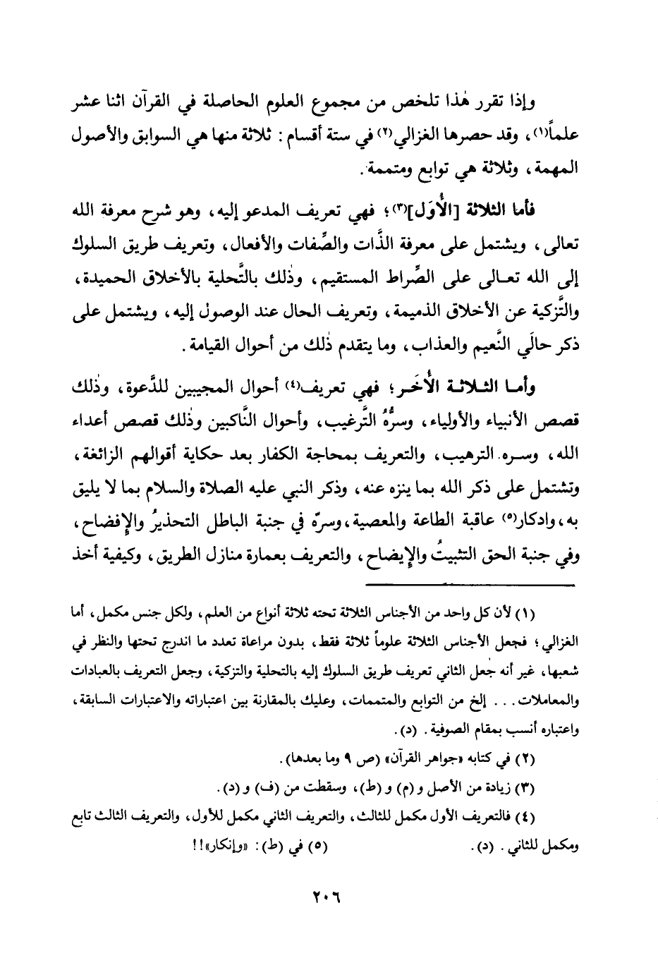 1 لأن كل واحد من الأجناس الثلاثة تحته ثلاثة أنواع من العلم، ولكل جنس مكمل، أما الغزالي؛ فجعل الأجناس الثلاثة علومًا ثلاثة فقط، بدون مراعاة تعدد ما اندرج تحتها والنظر في شعبها، غير أنه جعل الثاني تعريف طريق السلوك إليه بالتحلية والتزكية، وجعل التعريف بالعبادات والمعاملات ... إلخ من التوابع والمتممات، وعليك بالمقارنة بين اعتباراته والاعتبارات السابقة، واعتباره أنسب بمقام الصوفية. "د".