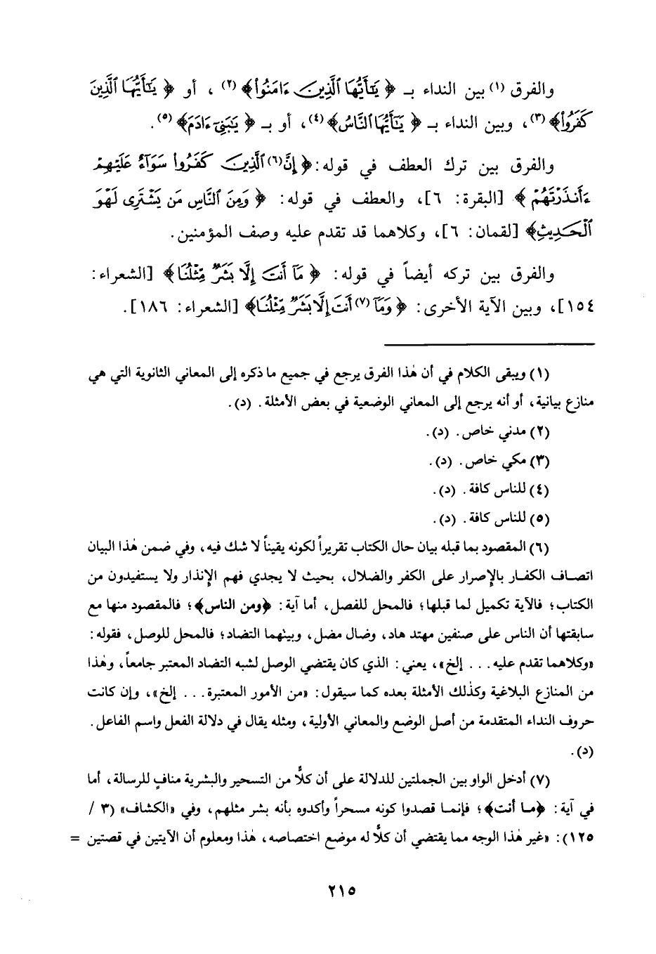 وَالْفَرْقُ1 بَيْنَ النِّدَاءِ بِـ {يَا أَيُّهَا الَّذِينَ آمَنُوا} 2، أَوْ {يَا أَيُّهَا الَّذِينَ كَفَرُوا} 3، وَبَيْنَ النِّدَاءِ بِـ {يَا أَيُّهَا النَّاسُ} 4، أَوْ بِـ {يَا بَنِي آدَمَ} 5.