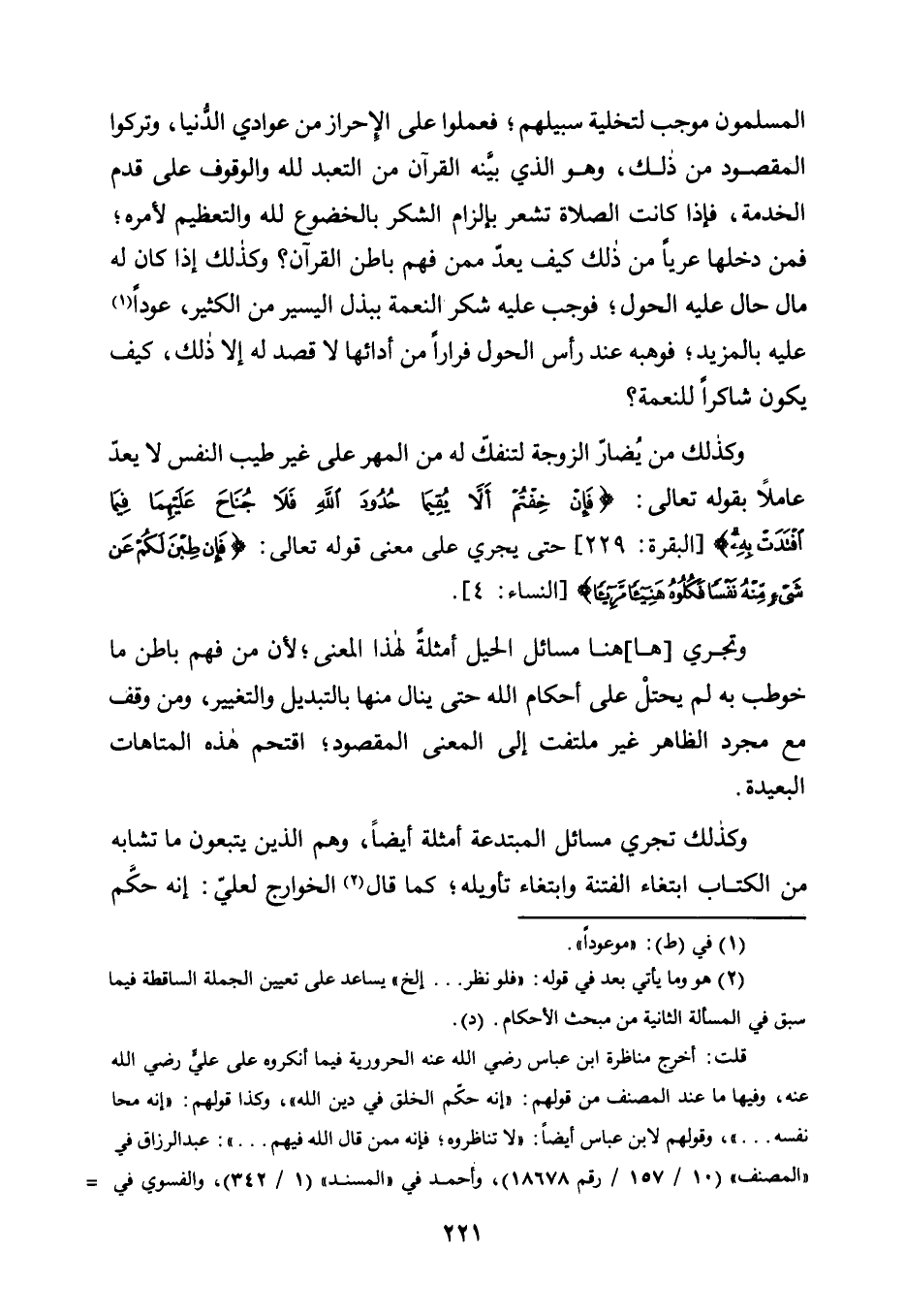 الْمُسْلِمُونَ مُوجِبٌ لِتَخْلِيَةِ سَبِيلِهِمْ؛ فَعَمِلُوا عَلَى الْإِحْرَازِ مِنْ عَوَادِي الدُّنْيَا، وَتَرَكُوا الْمَقْصُودَ مِنْ ذَلِكَ، وَهُوَ الَّذِي بَيَّنَهُ الْقُرْآنُ مِنَ التَّعَبُّدِ لِلَّهِ وَالْوُقُوفِ عَلَى قَدَمِ الْخِدْمَةِ، فَإِذَا كَانَتِ الصَّلَاةُ تُشْعِرُ بِإِلْزَامِ الشُّكْرِ بِالْخُضُوعِ لِلَّهِ وَالتَّعْظِيمِ لِأَمْرِهِ؛ فَمَنْ دَخَلَهَا عَرِيًّا مِنْ ذَلِكَ كَيْفَ يُعَدُّ مِمَّنْ فَهِمَ بَاطِنَ الْقُرْآنِ؟ وَكَذَلِكَ إِذَا كَانَ لَهُ مَالٌ حَالَ عَلَيْهِ الْحَوْلُ؛ فَوَجَبَ عَلَيْهِ شُكْرُ النِّعْمَةِ بِبَذْلِ الْيَسِيرِ مِنَ الْكَثِيرِ، عَوْدًا1 عَلَيْهِ بِالْمَزِيدِ؛ فَوَهَبَهُ عِنْدَ رَأْسِ الْحَوْلِ فِرَارًا مِنْ أَدَائِهَا لَا قَصْدَ لَهُ إِلَّا ذَلِكَ، كَيْفَ يَكُونُ شَاكِرًا لِلنِّعْمَةِ؟